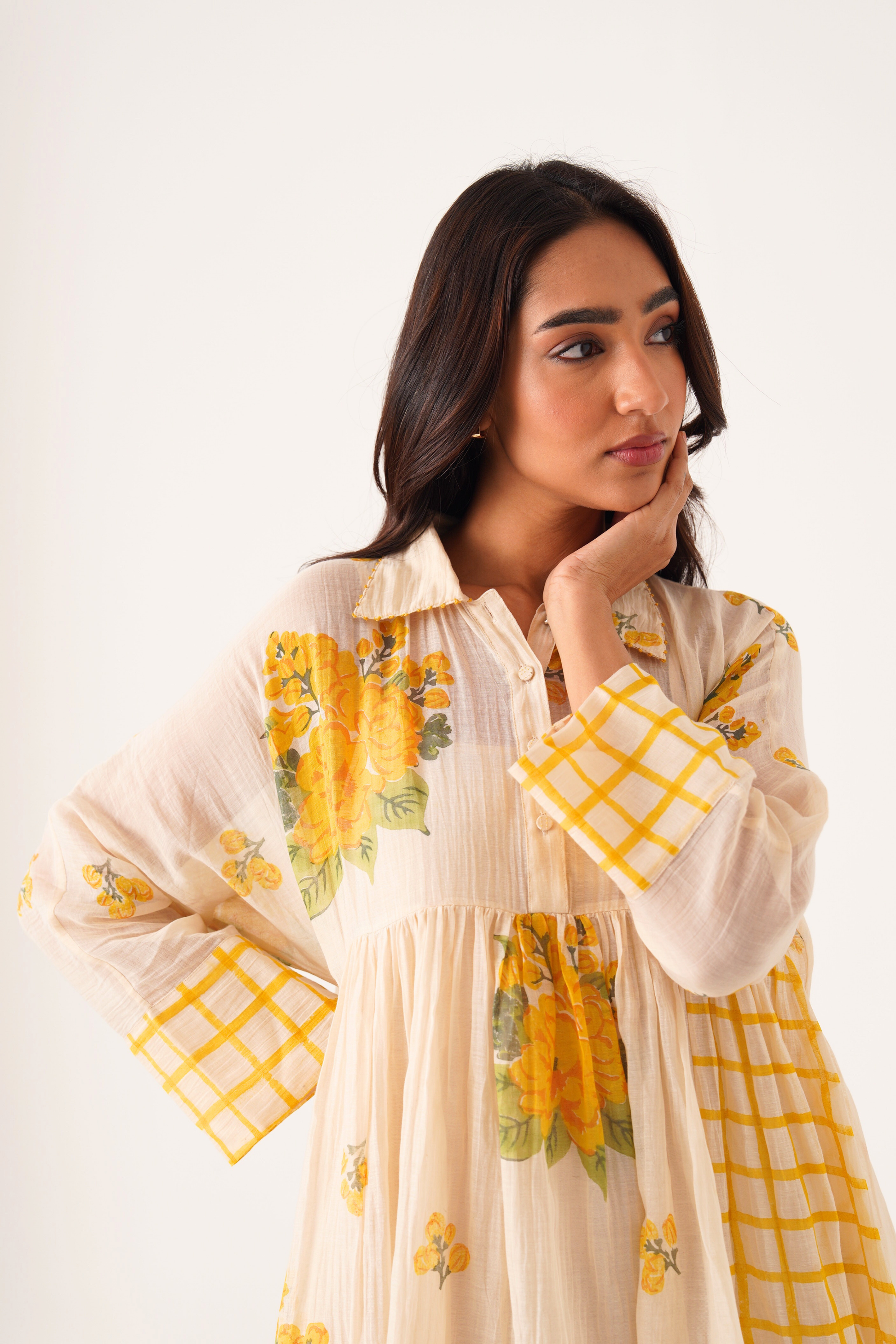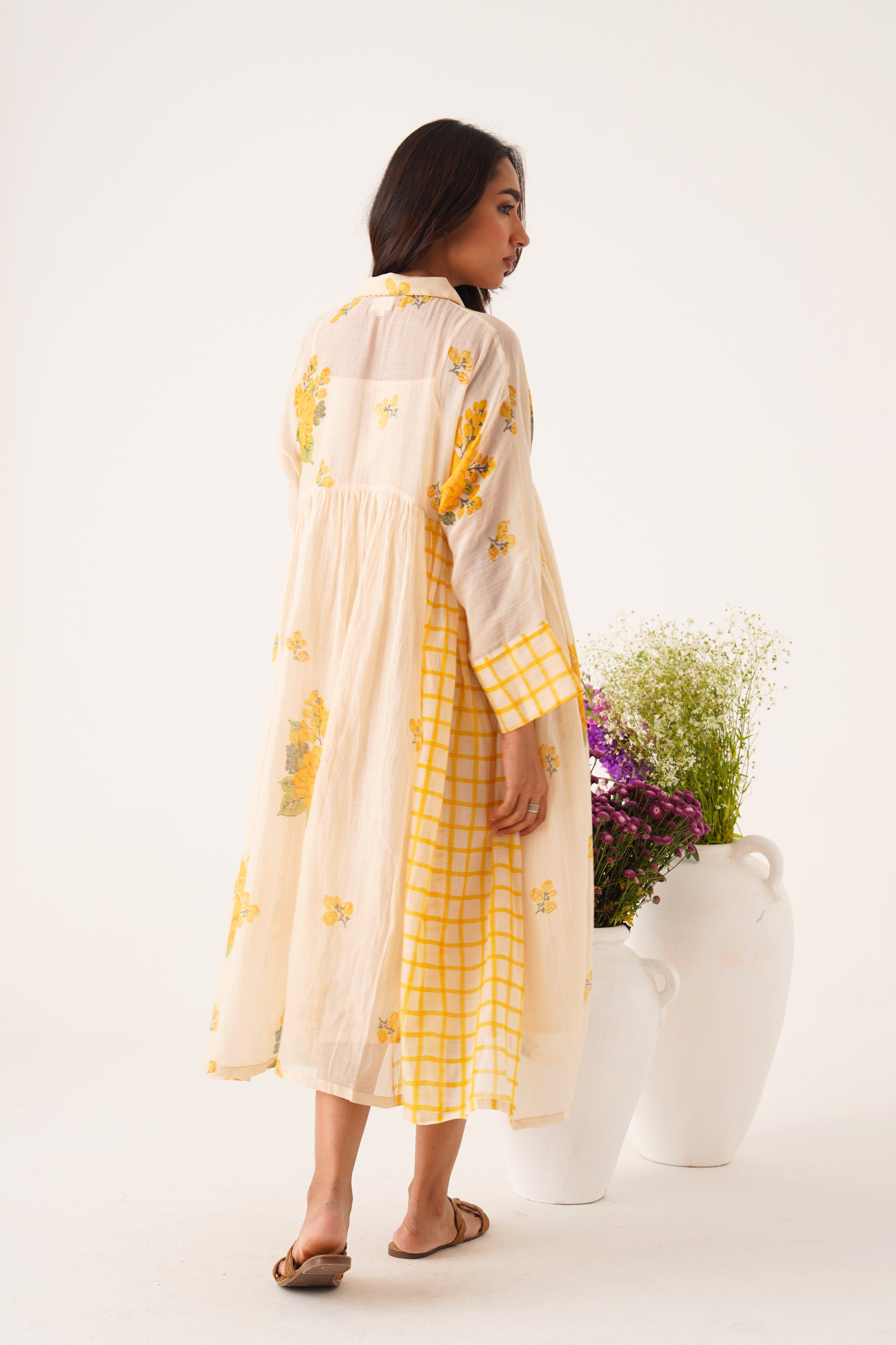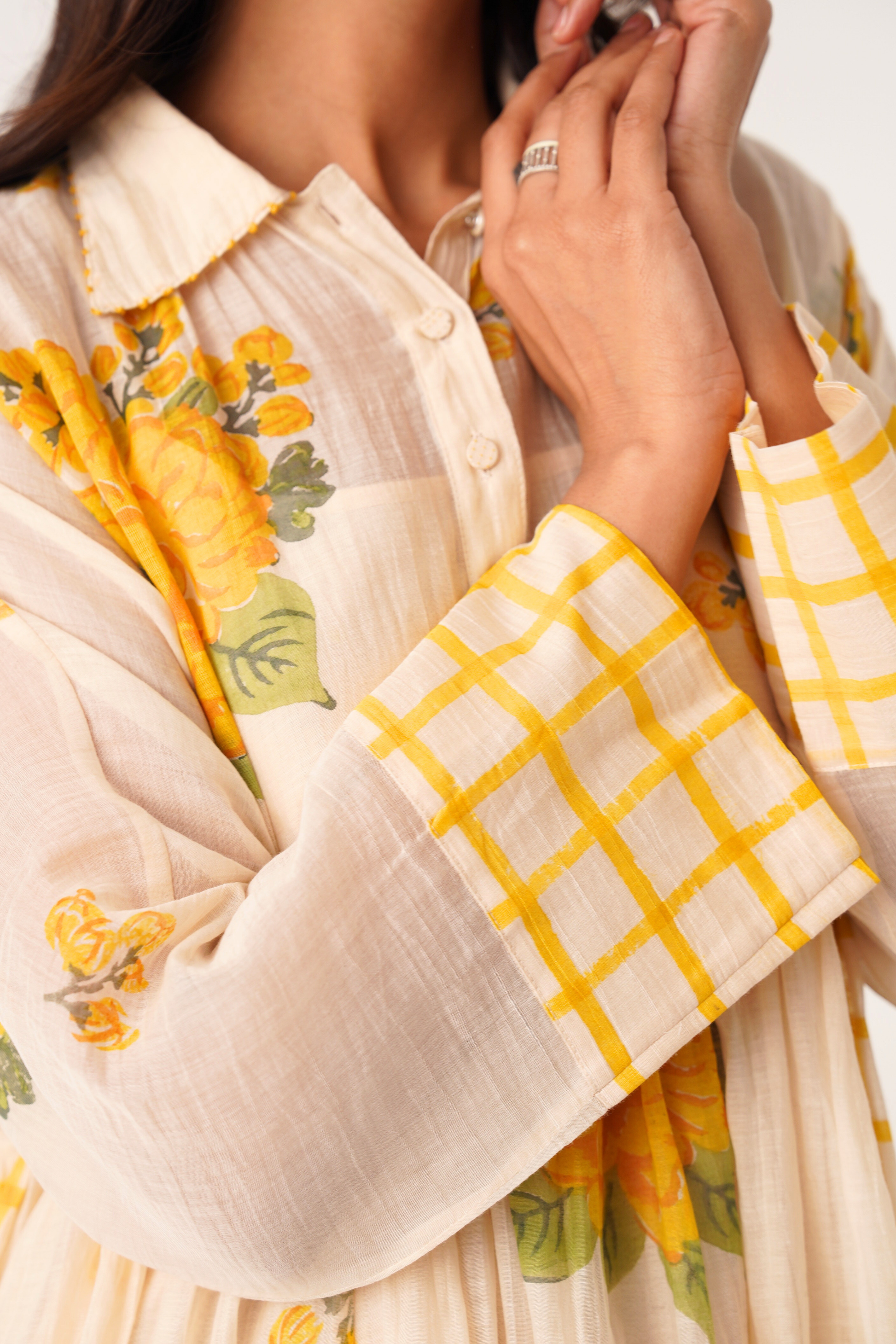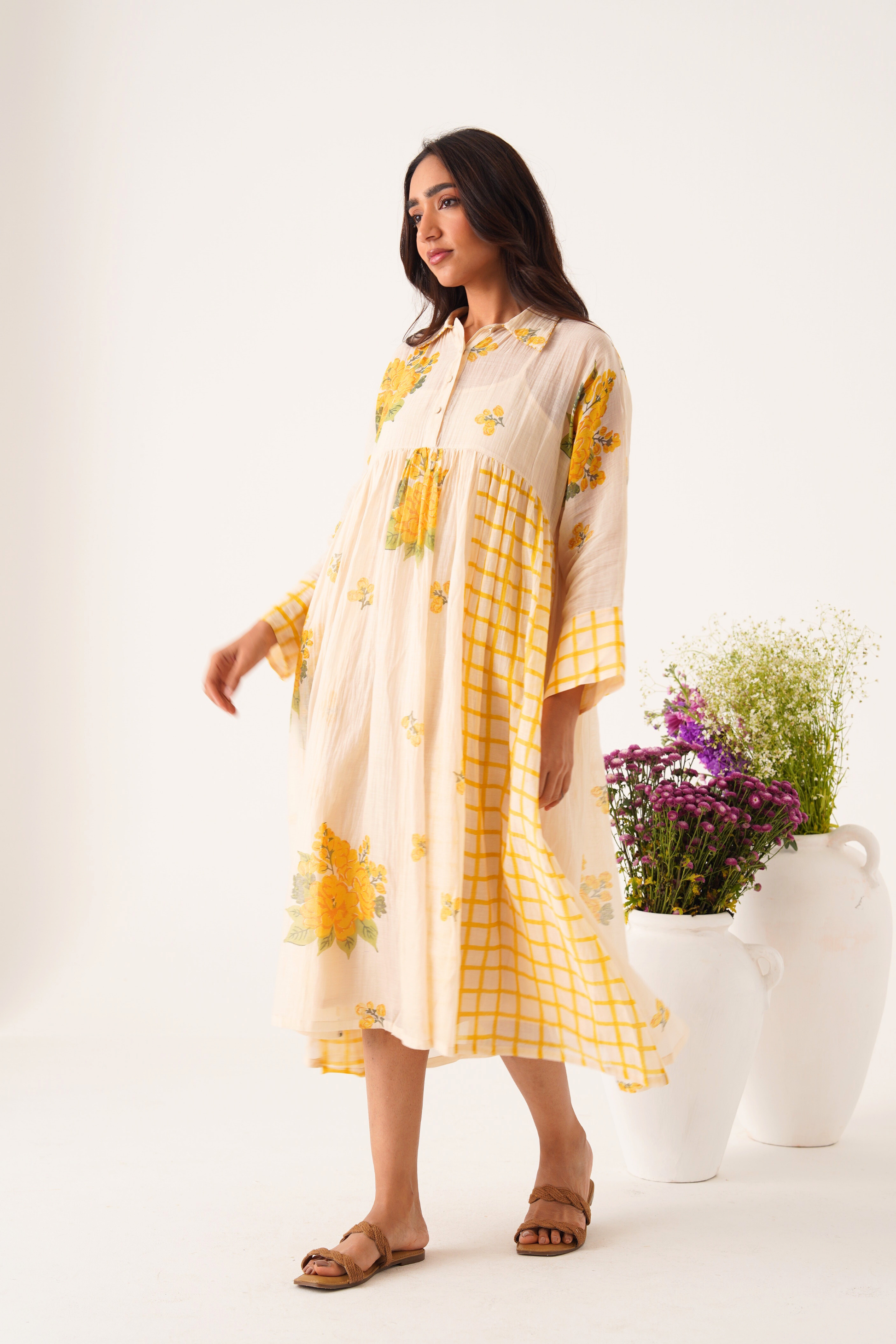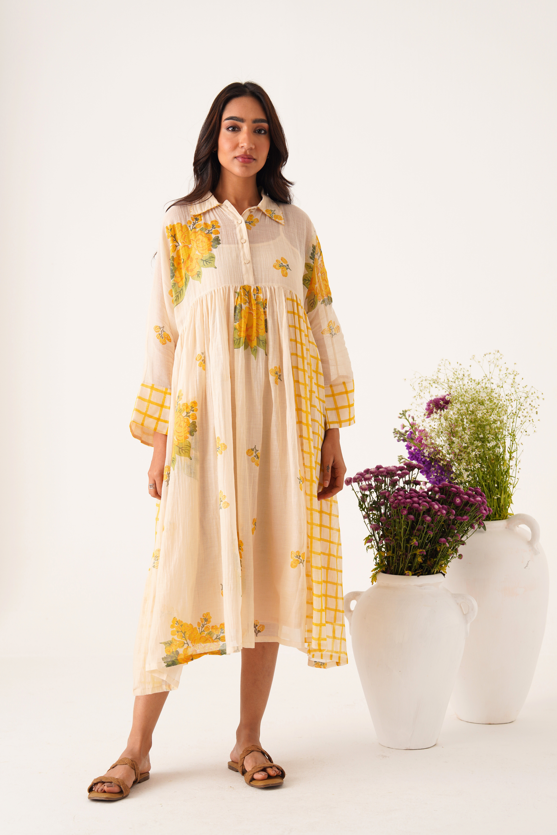 Scarlet ivory-yellow hand block printed chanderi collar dress