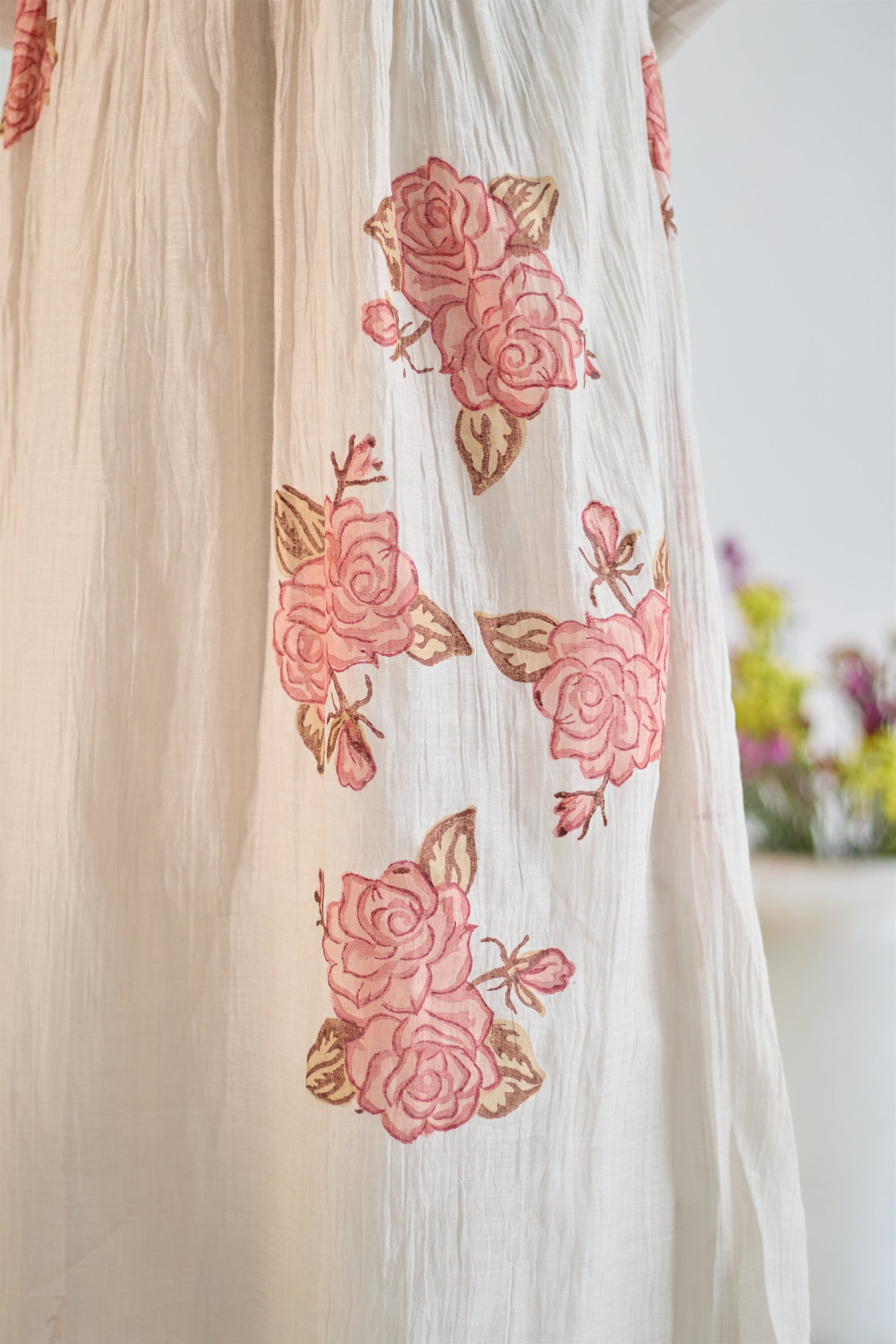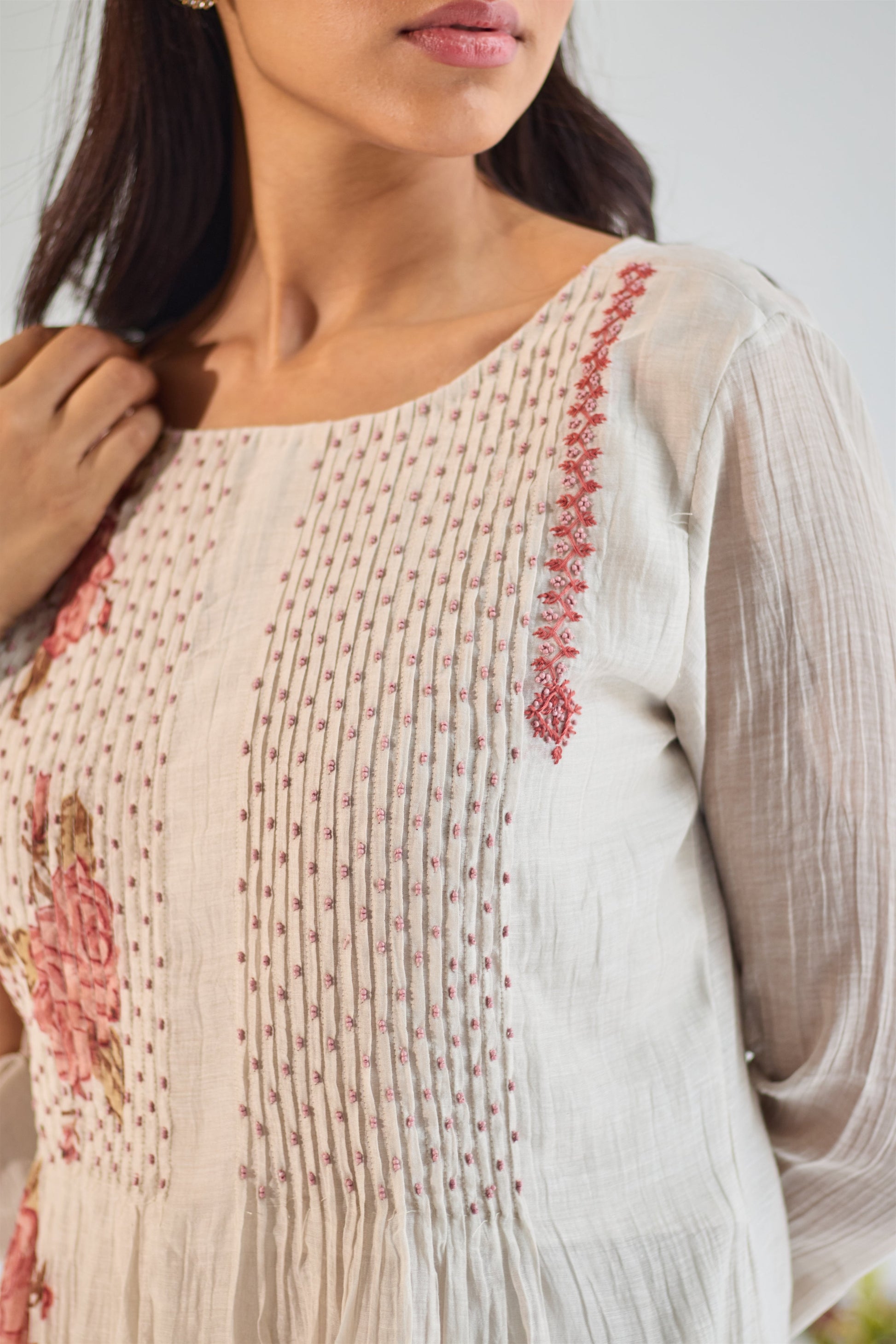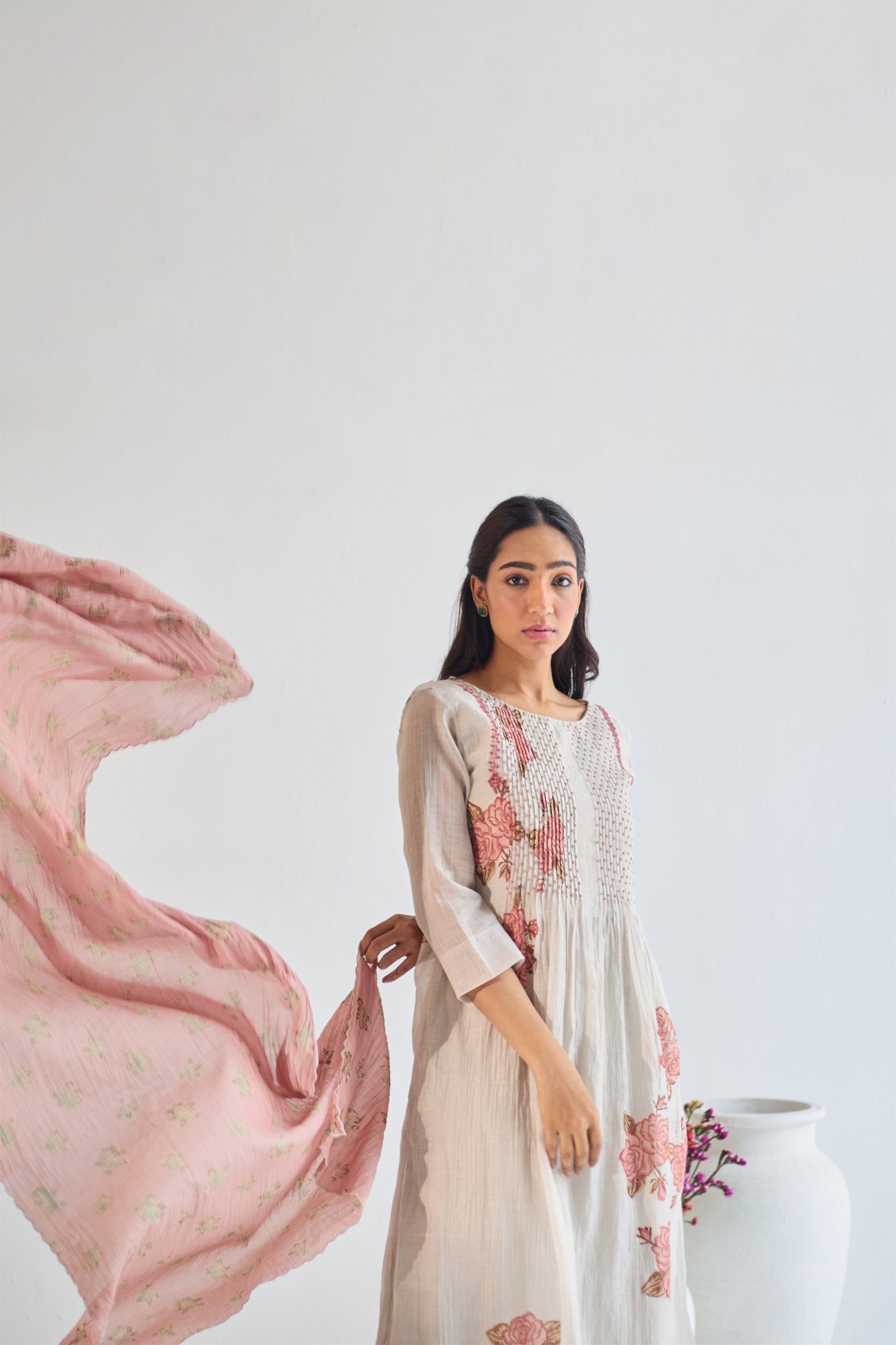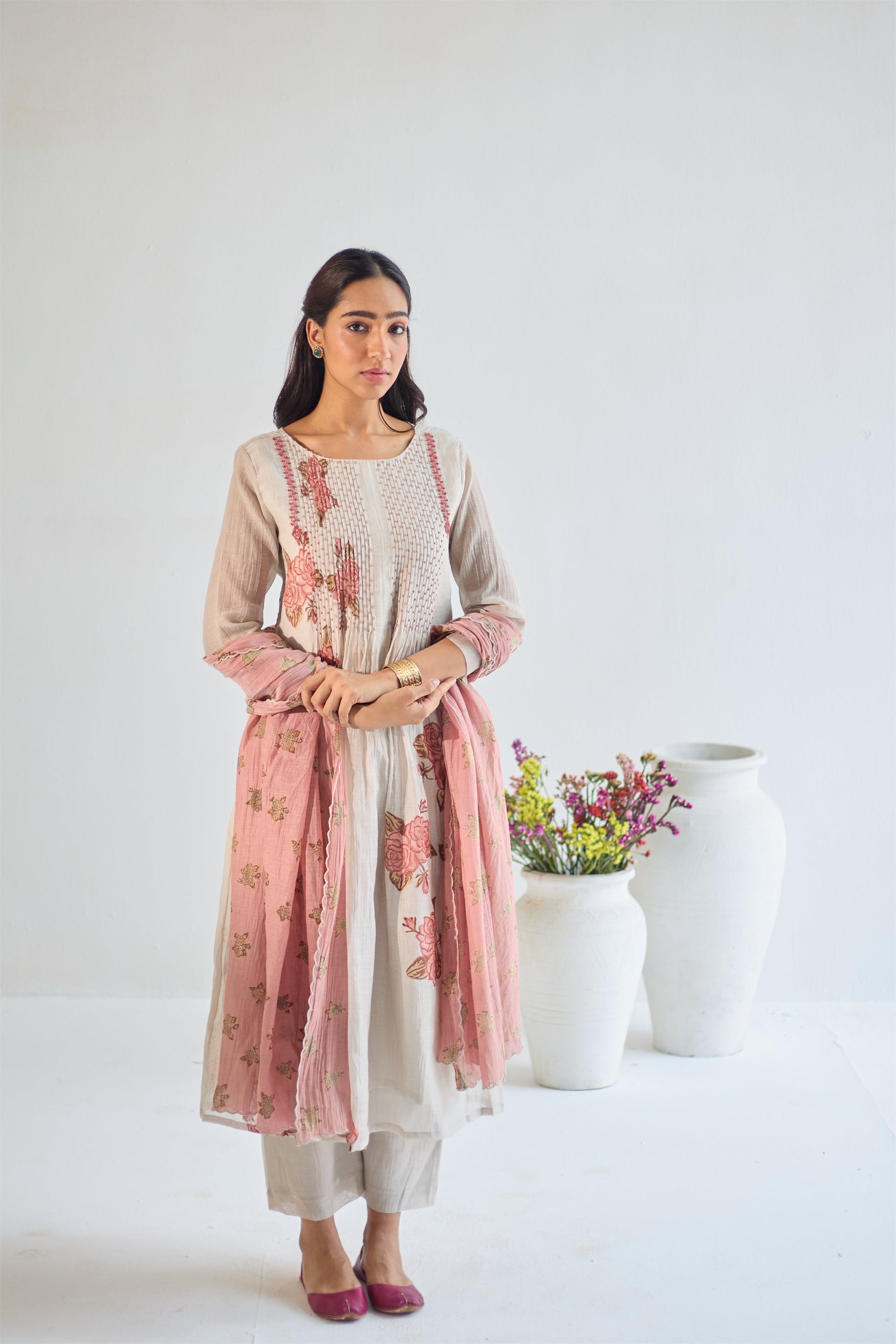 Rose grey peach hand block printed chanderi pintuck kurta set (set of 3)