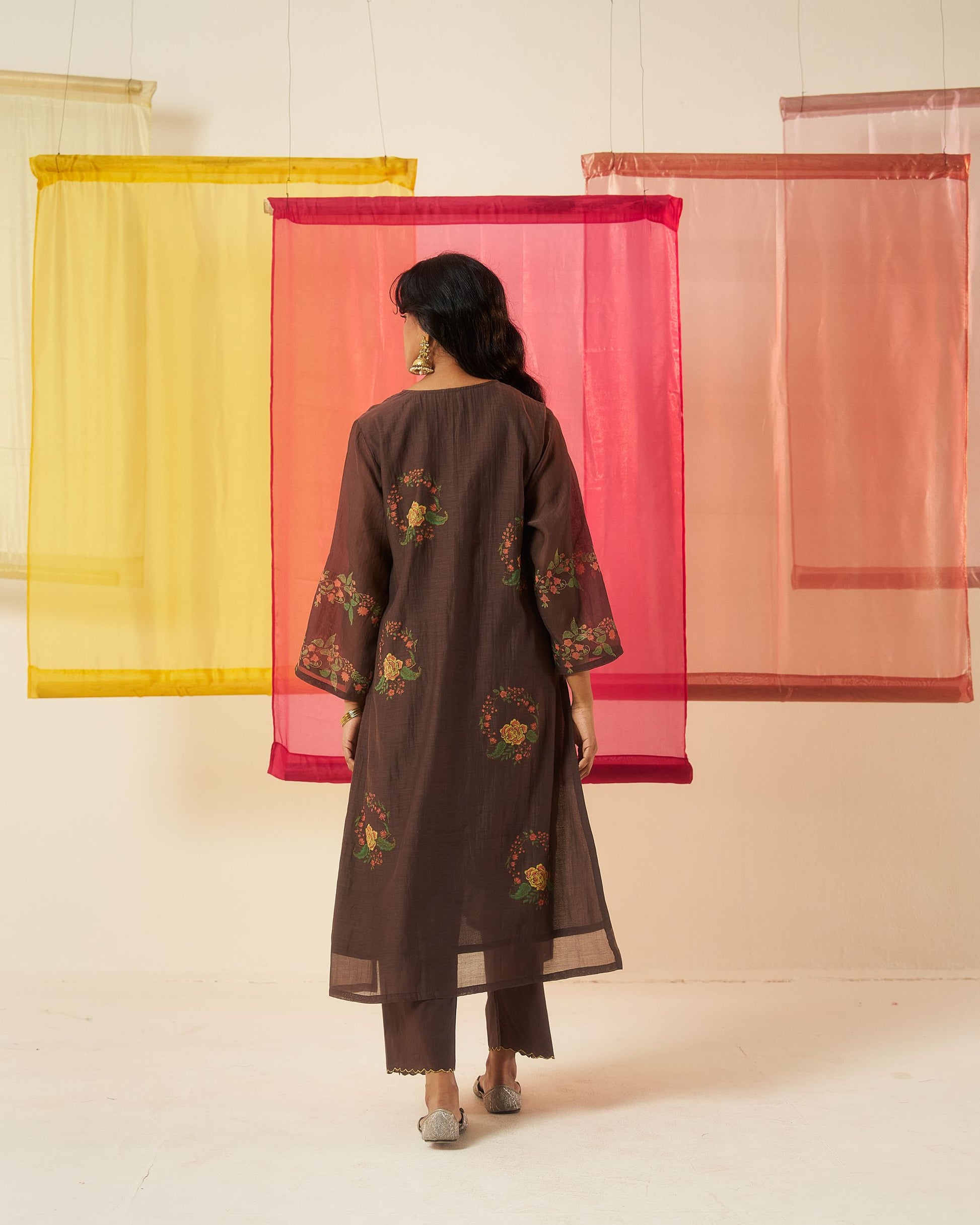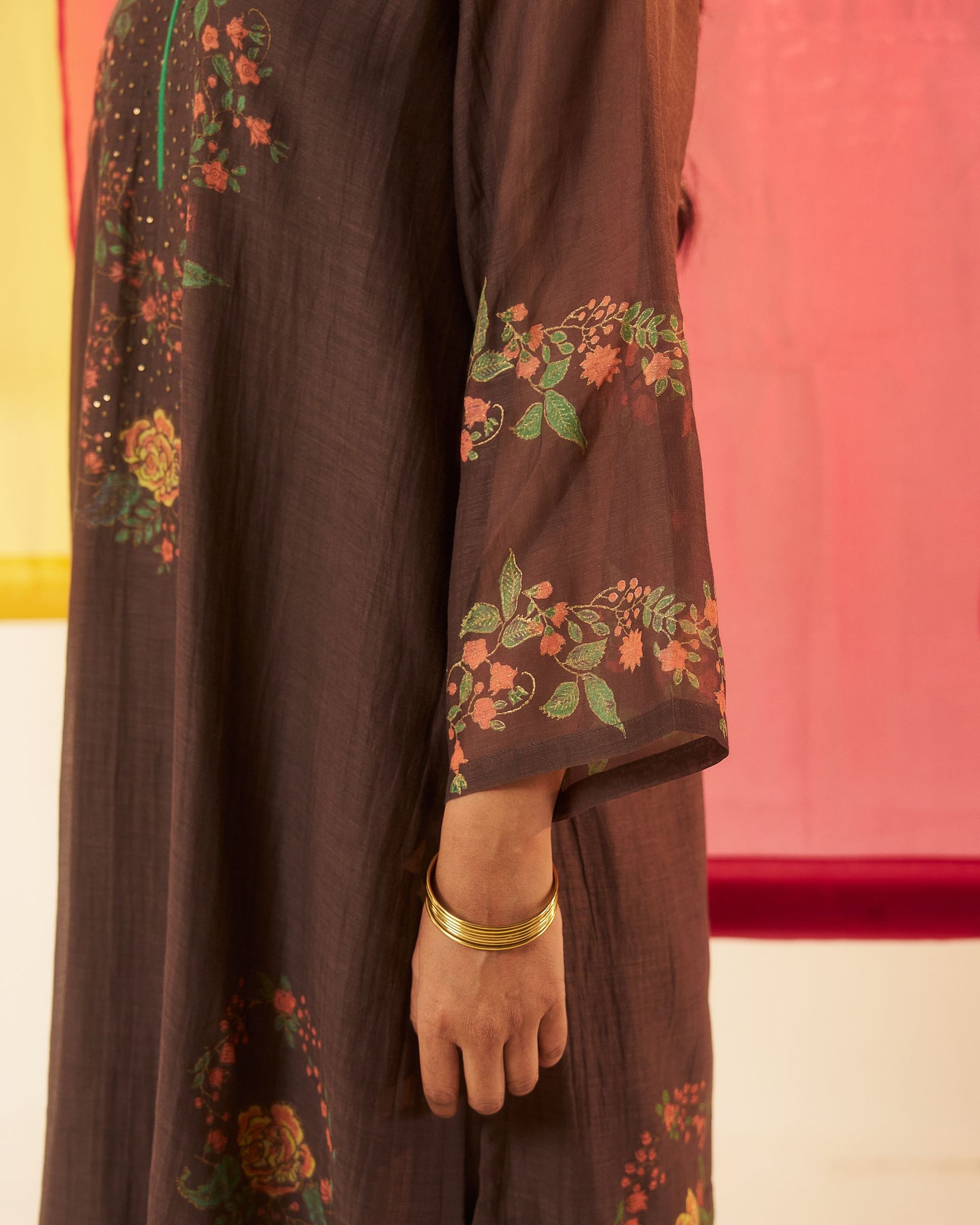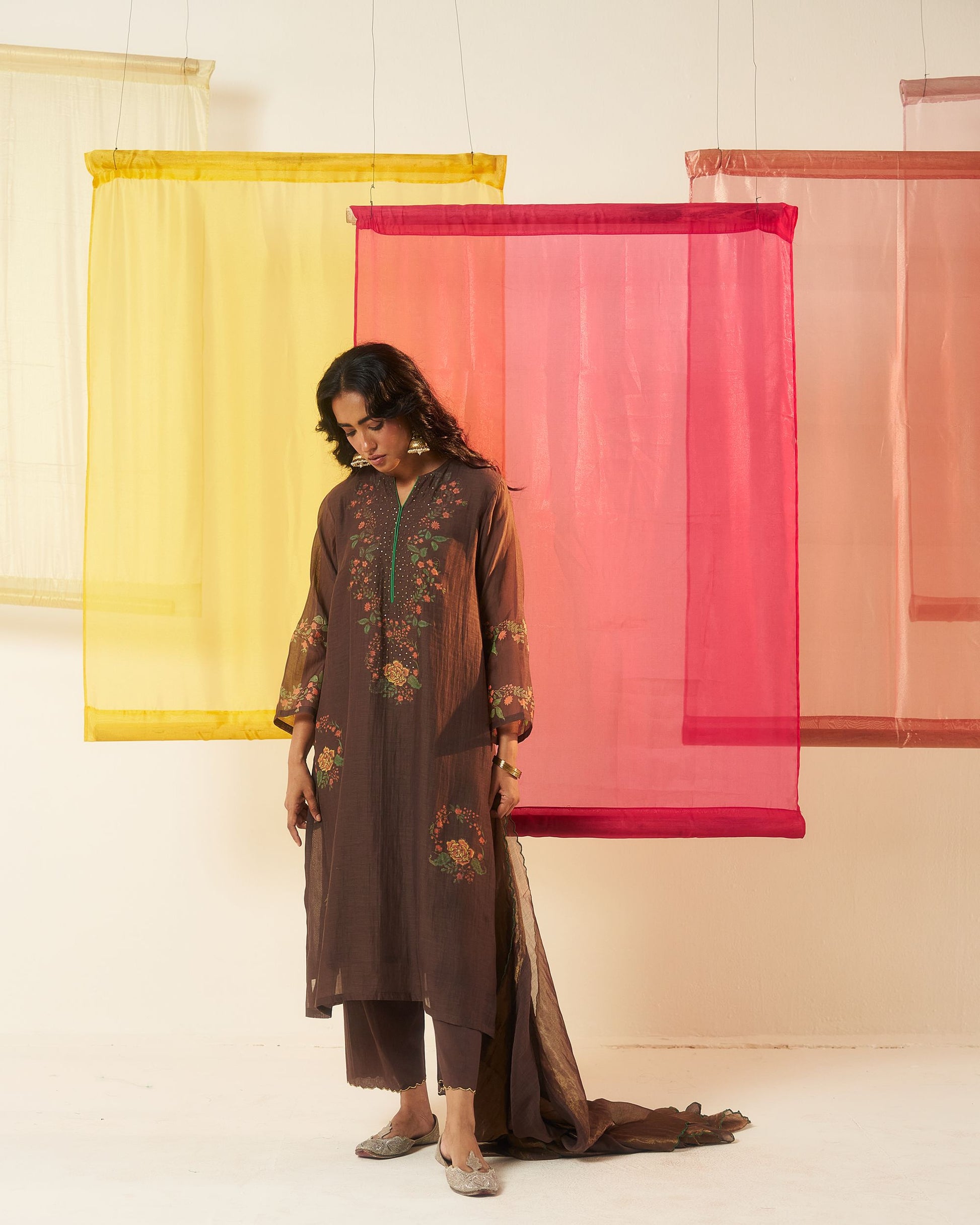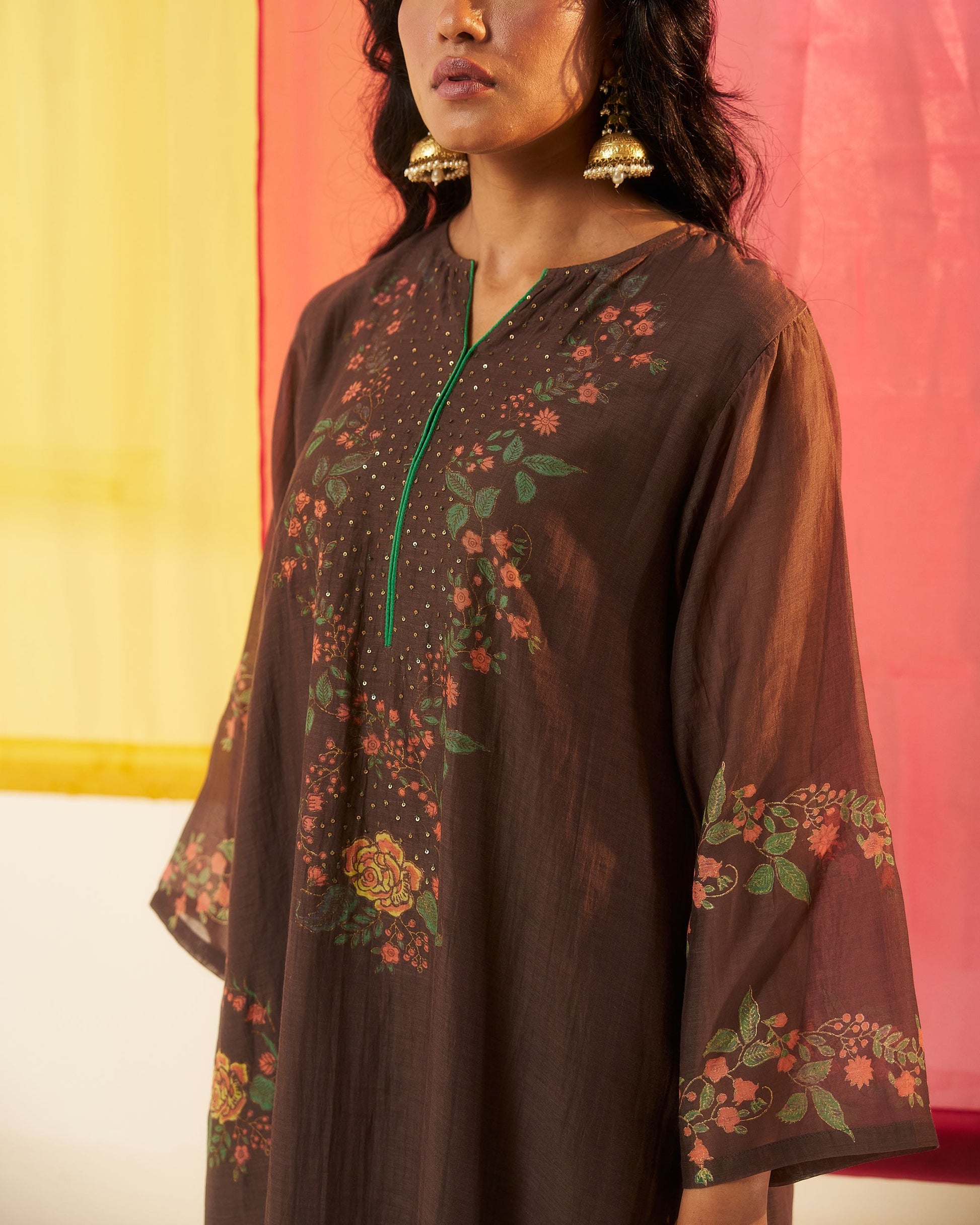 Sitara brown hand block printed sequin work chanderi kurta set.