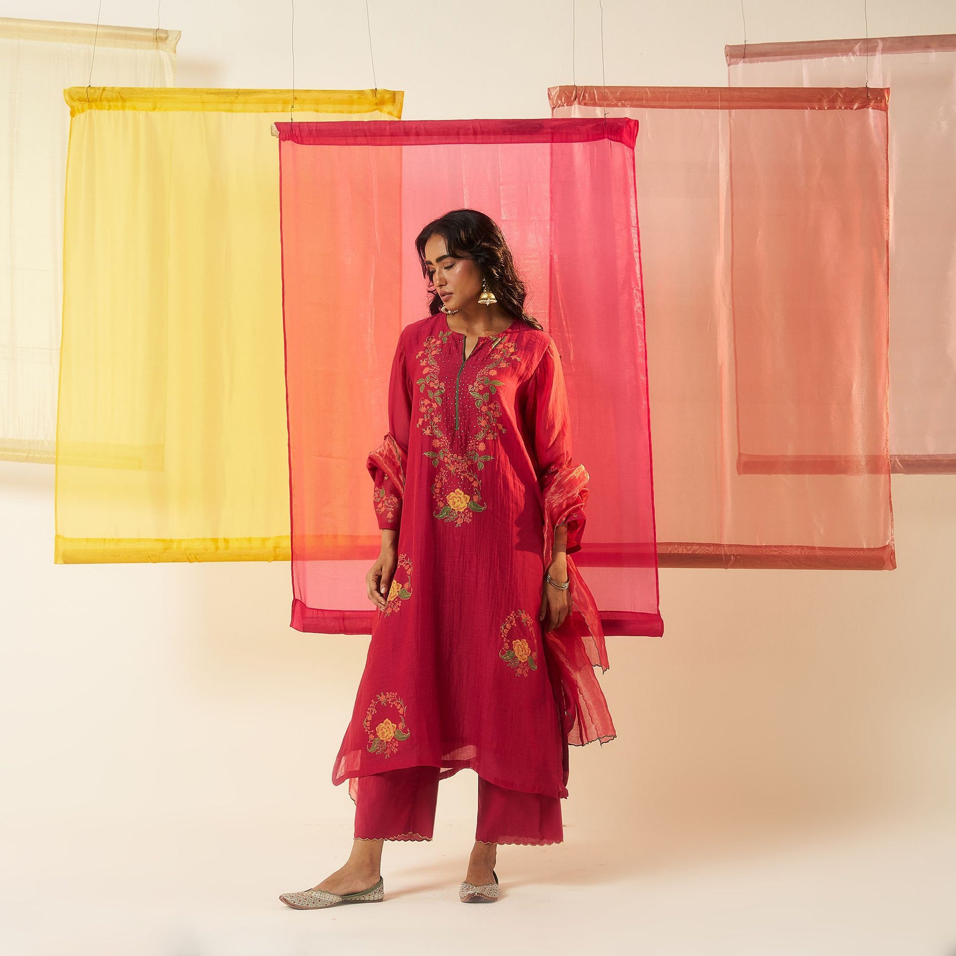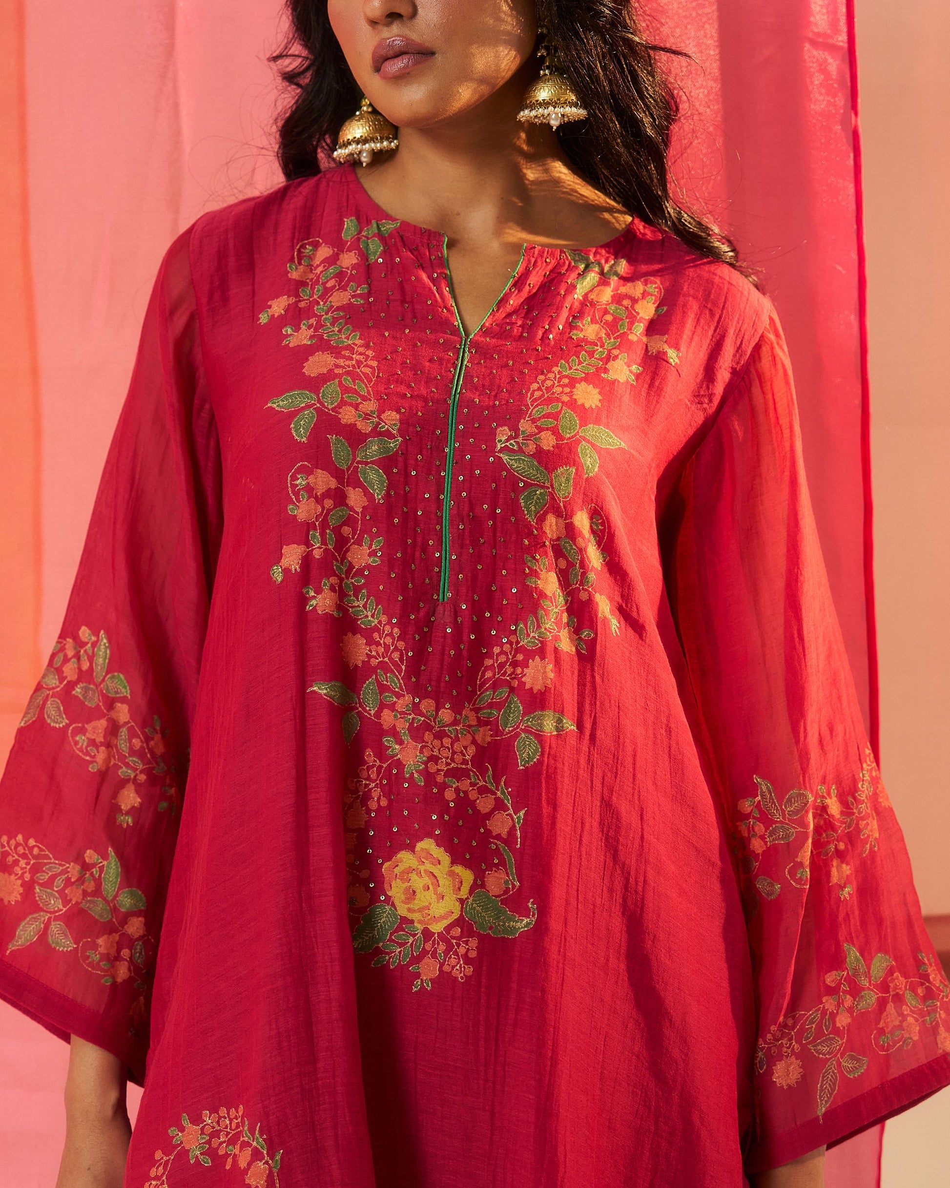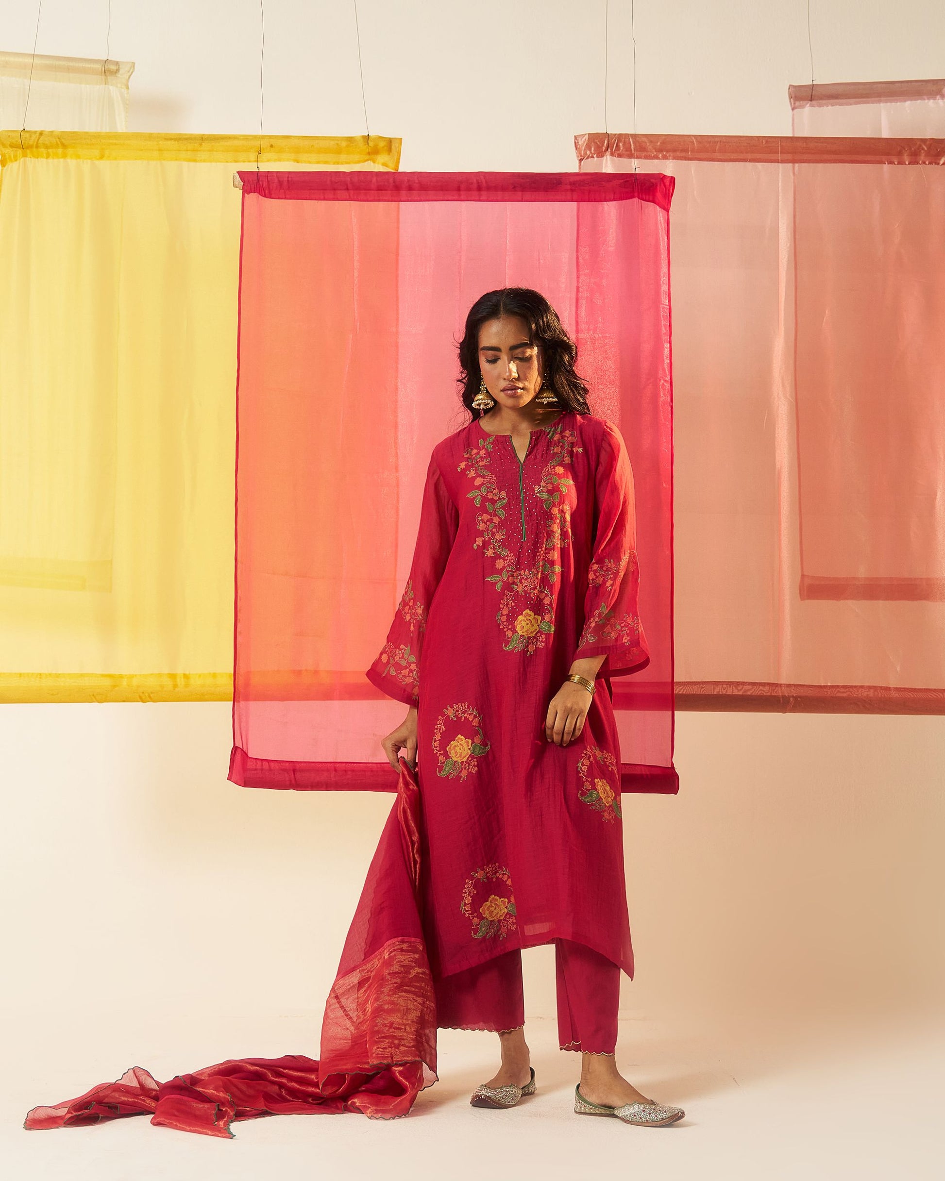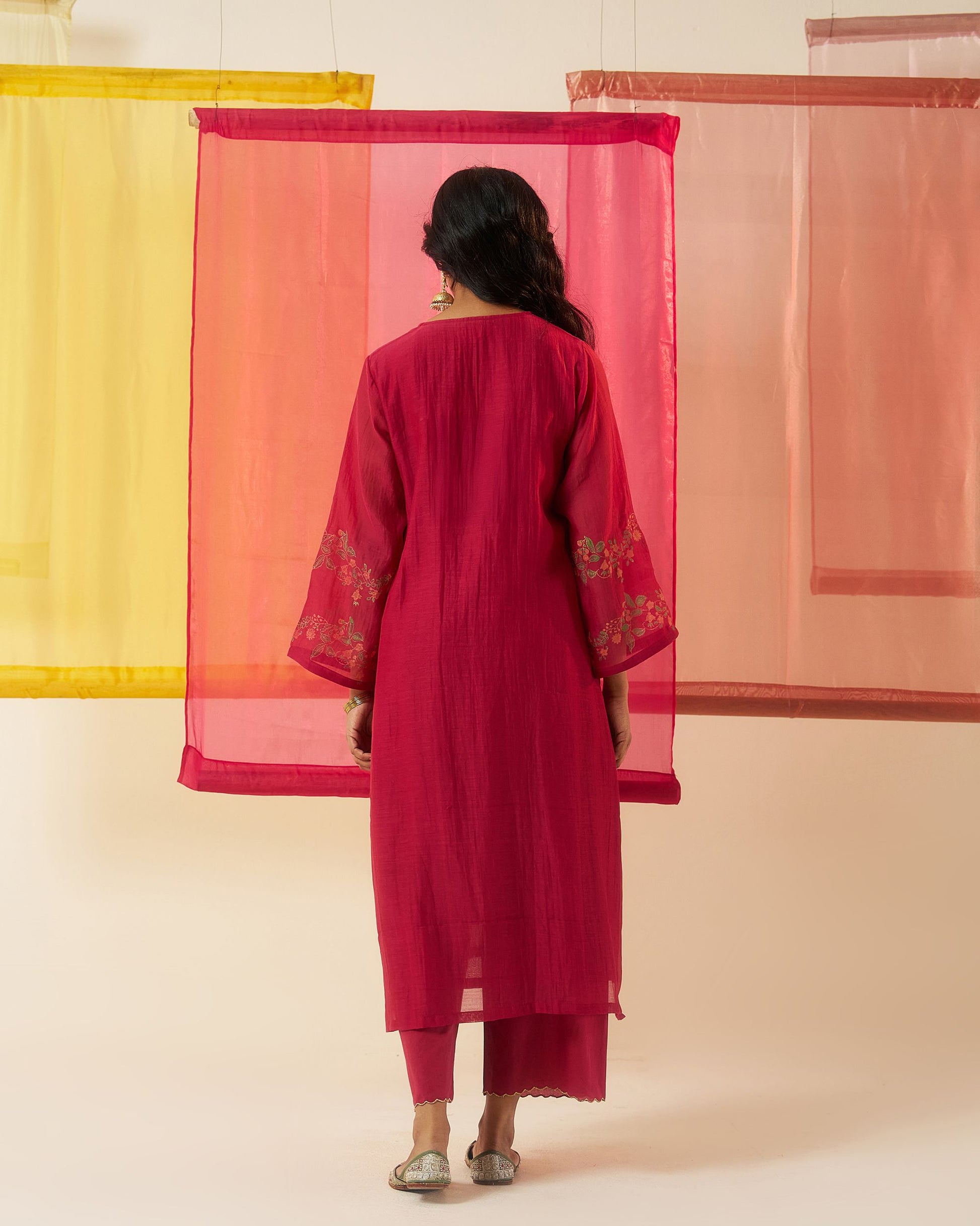 Sitara fuschia hand block printed sequin work chanderi kurta set.