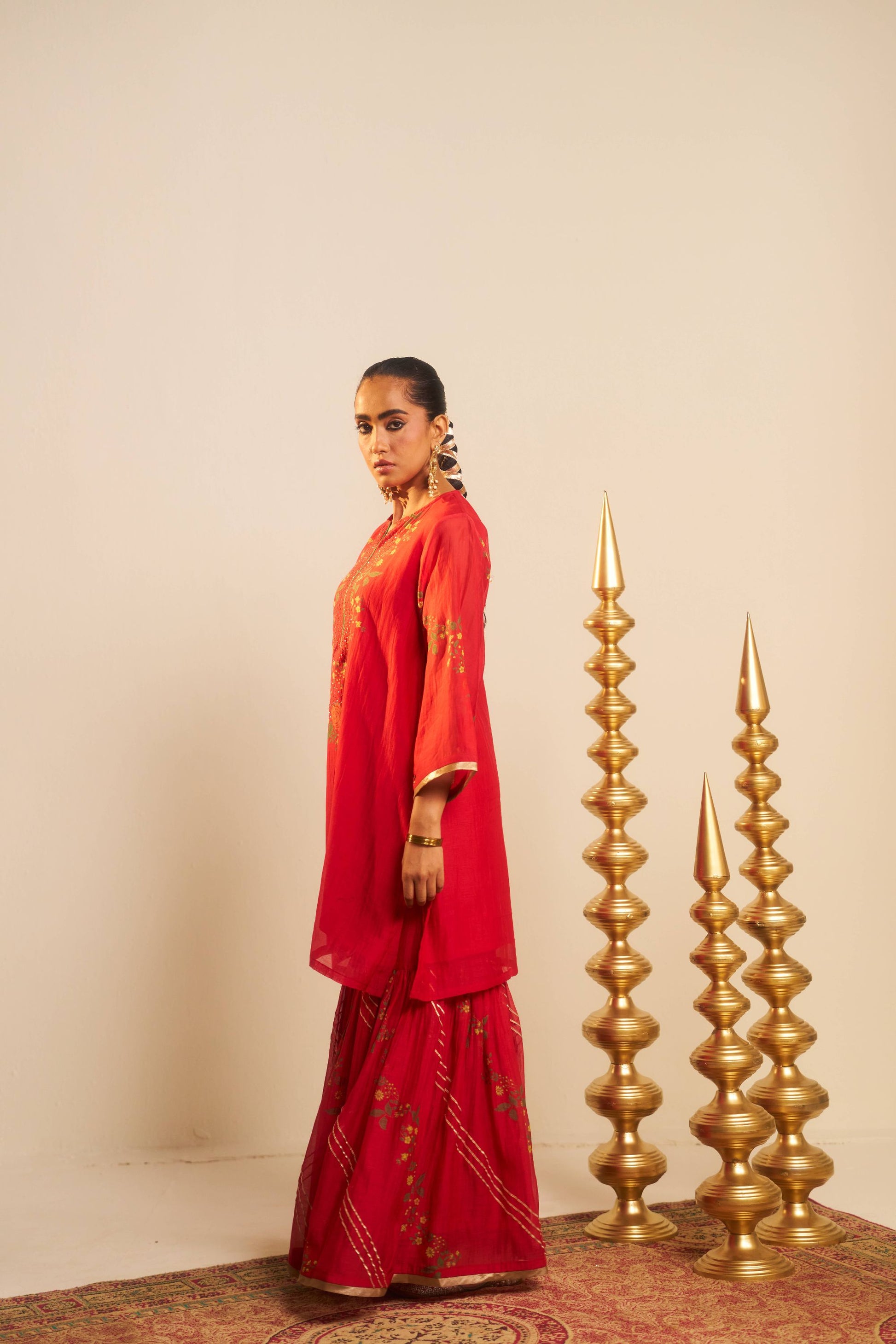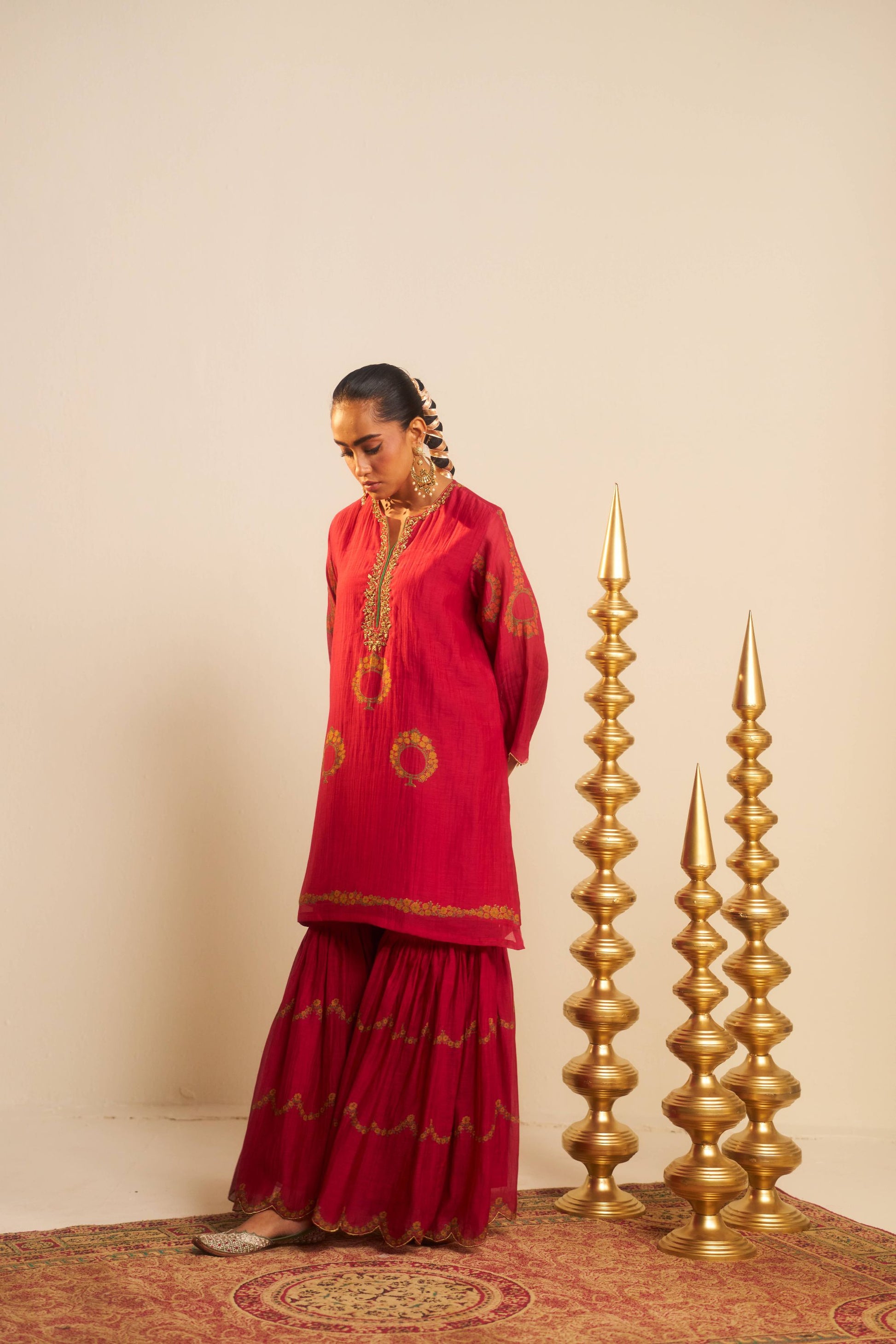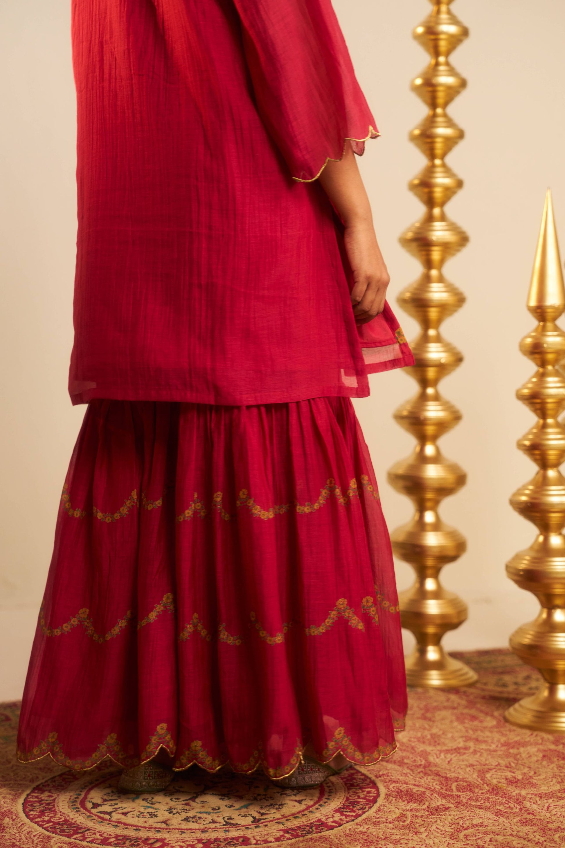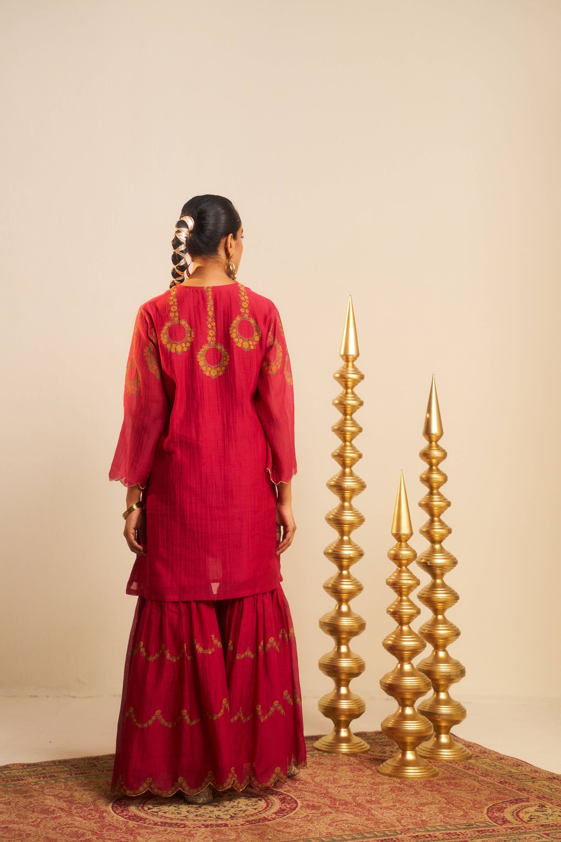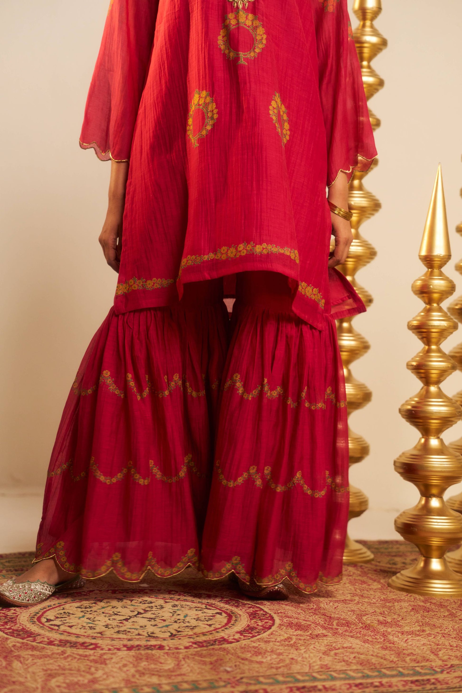 Siyaah red hand block printed dabka zardosi chanderi sharara set.