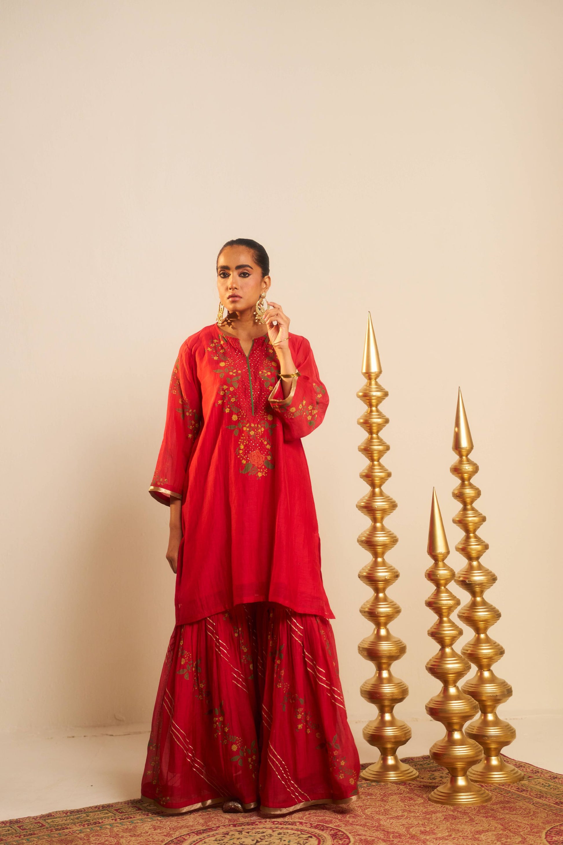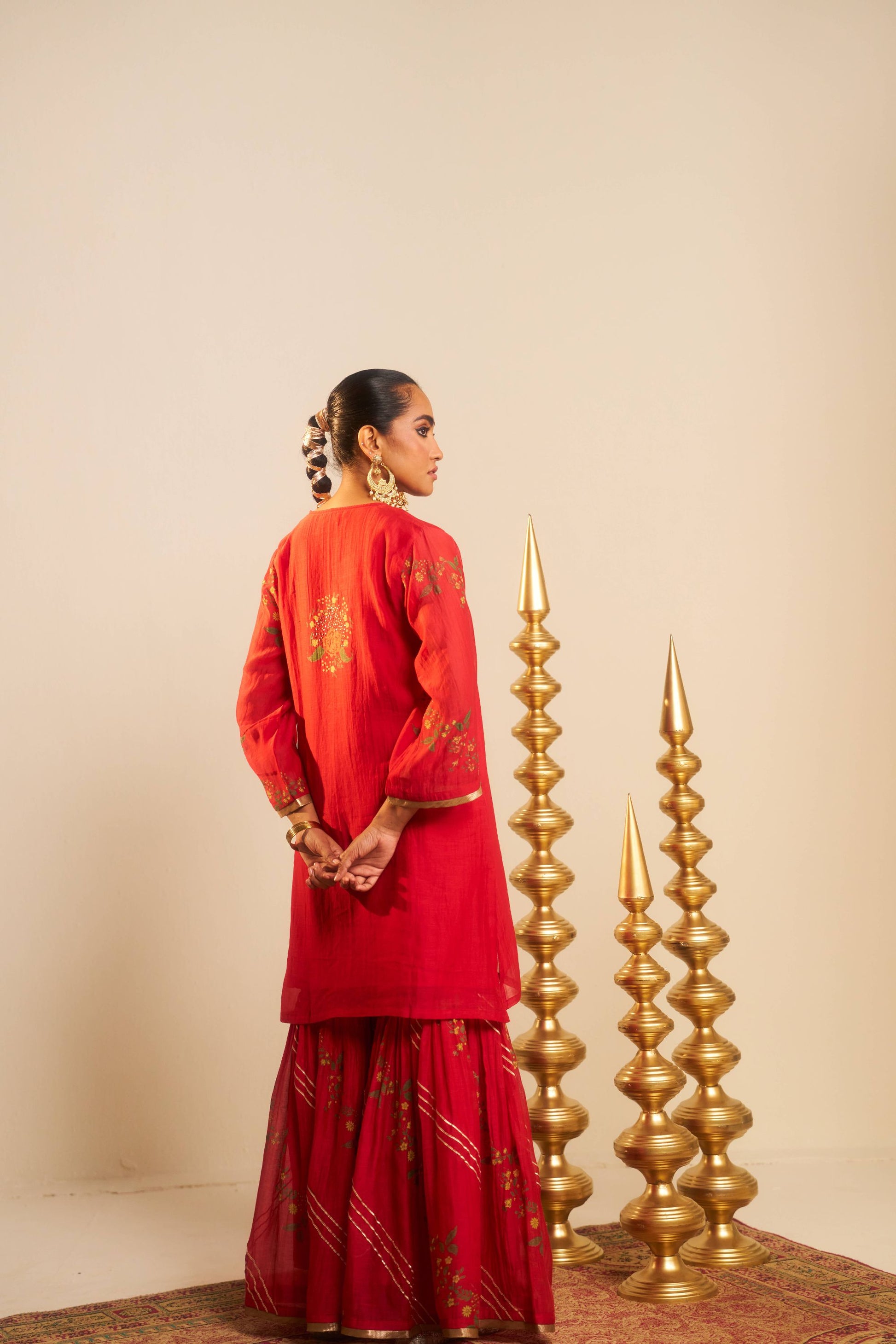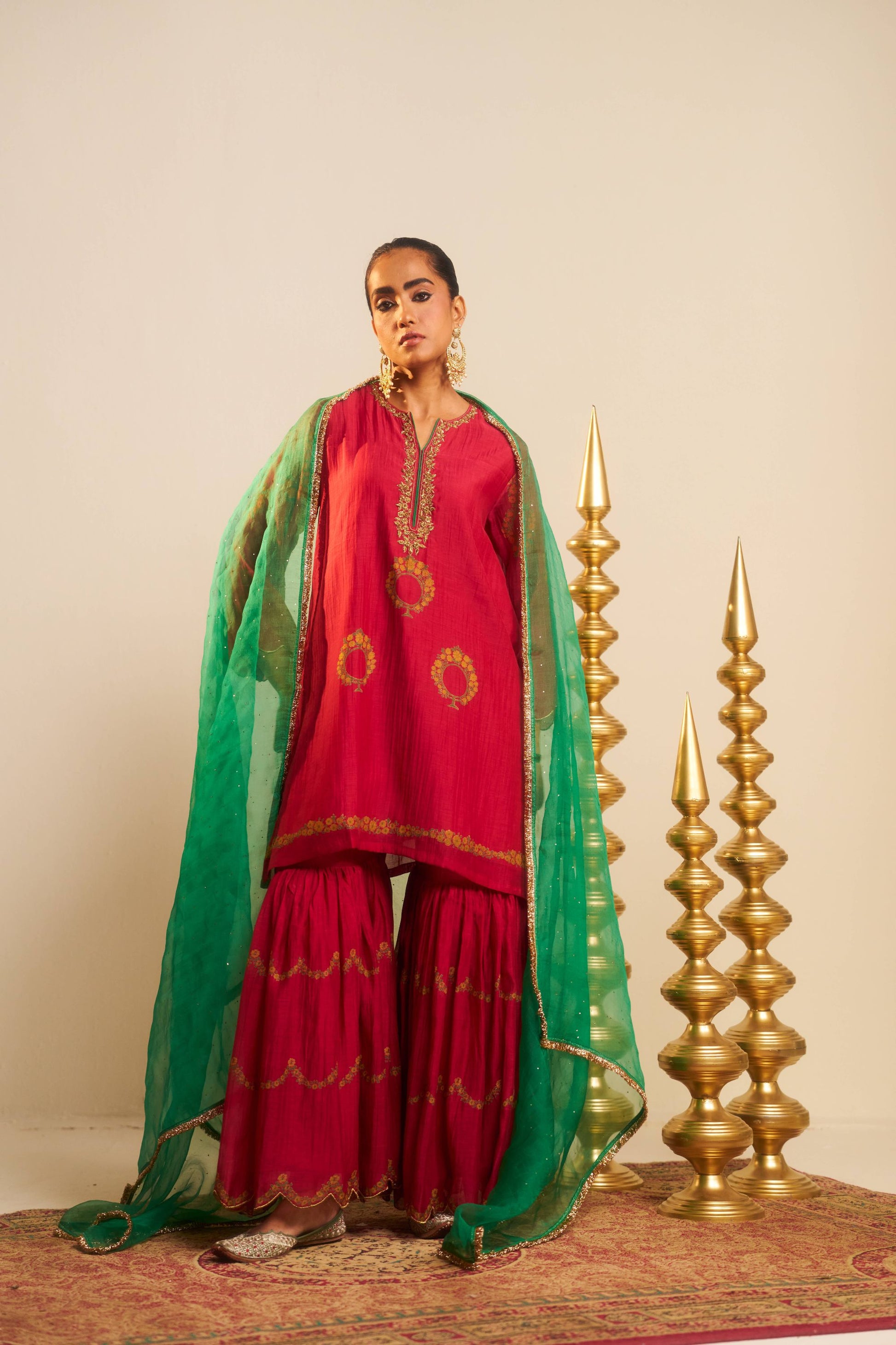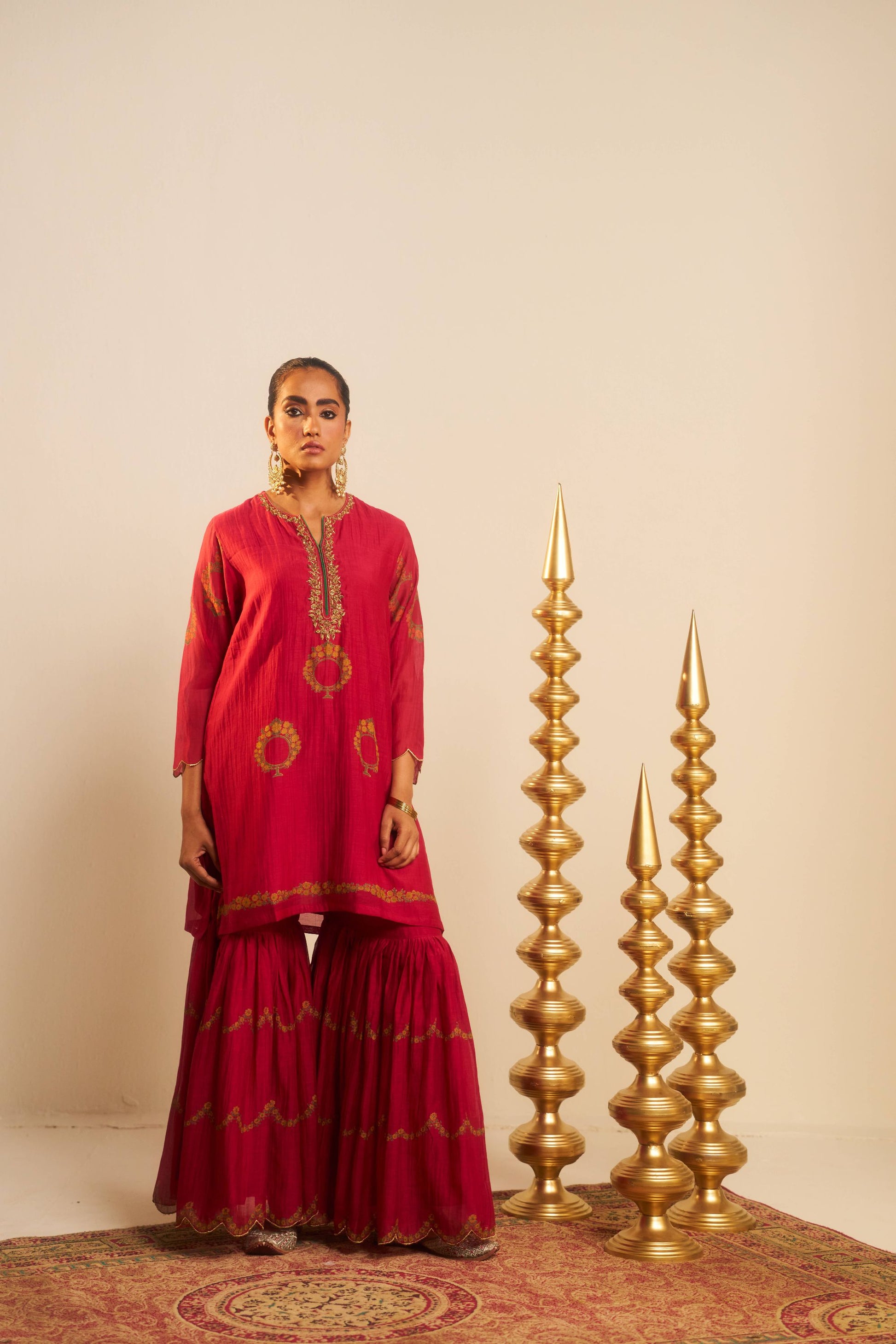 Siyaah red hand block printed dabka zardosi chanderi sharara set.