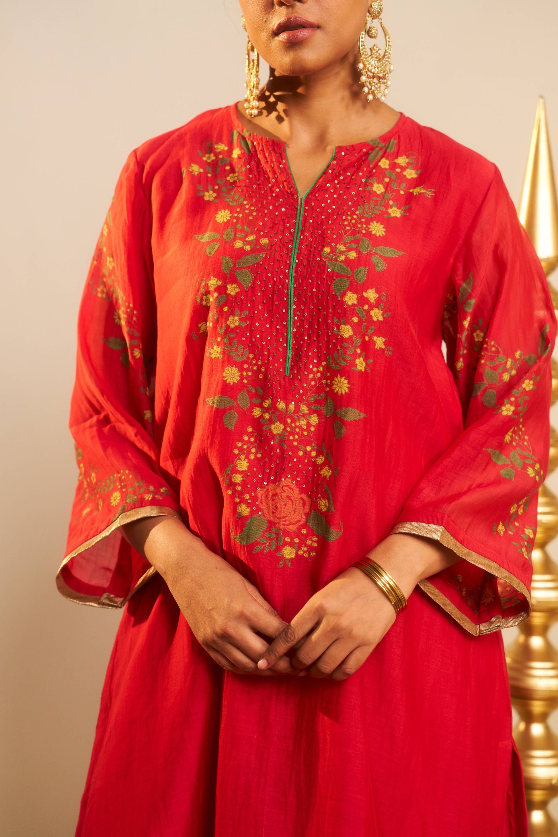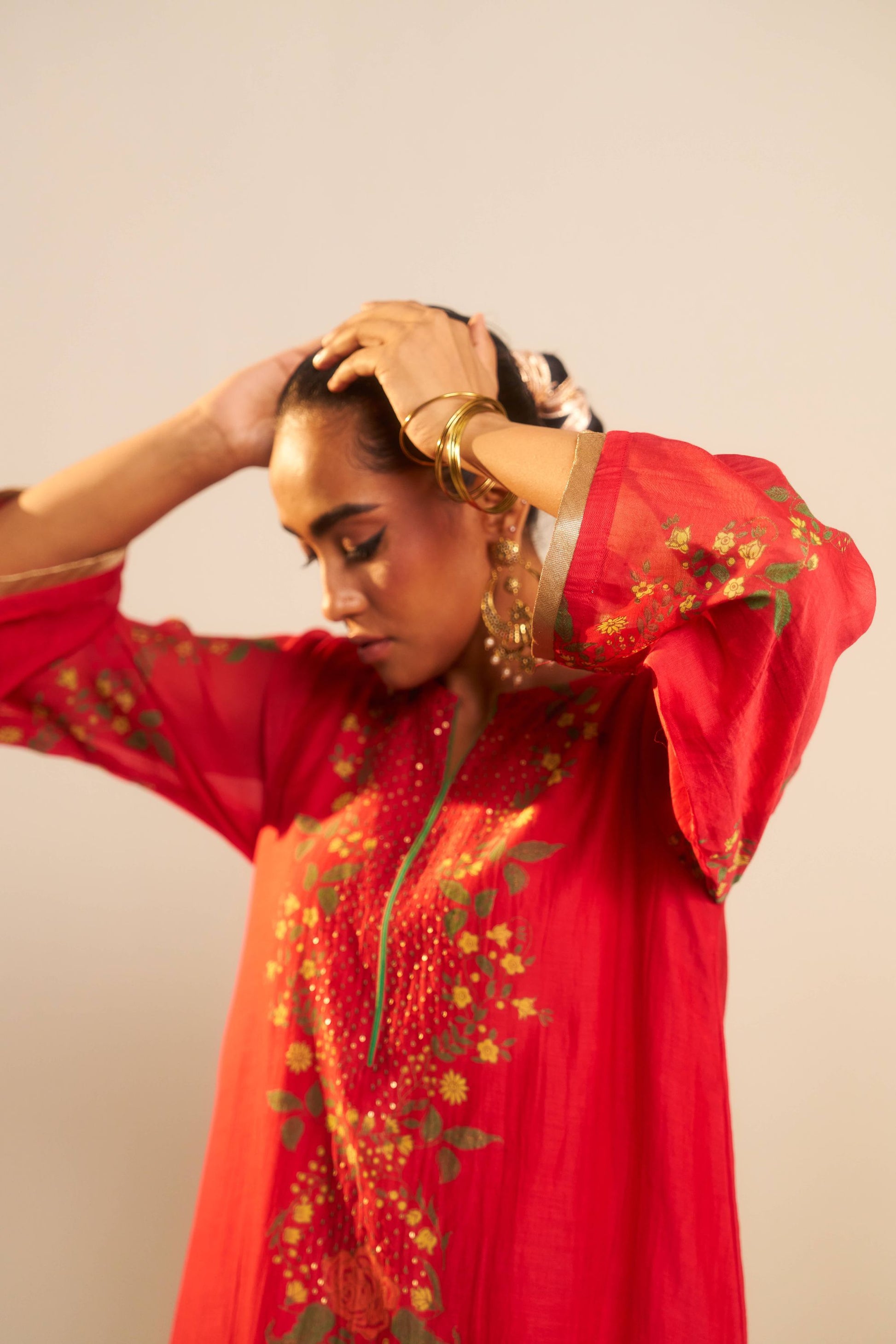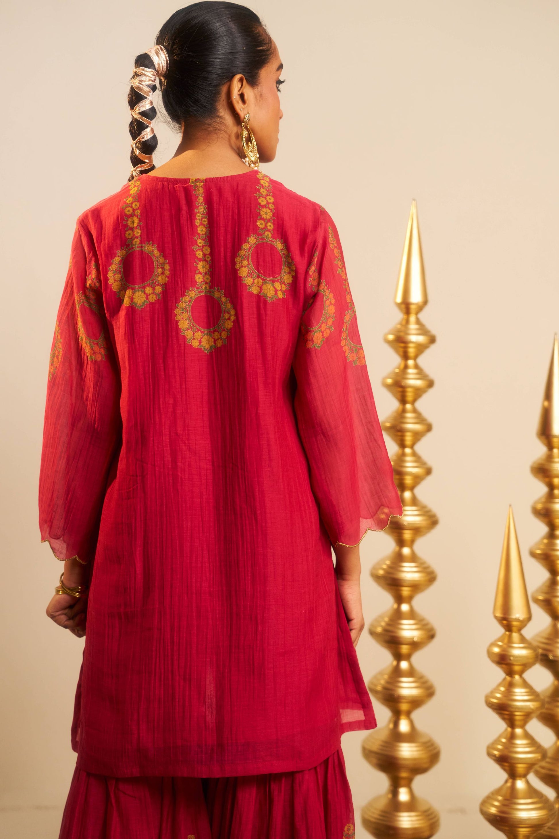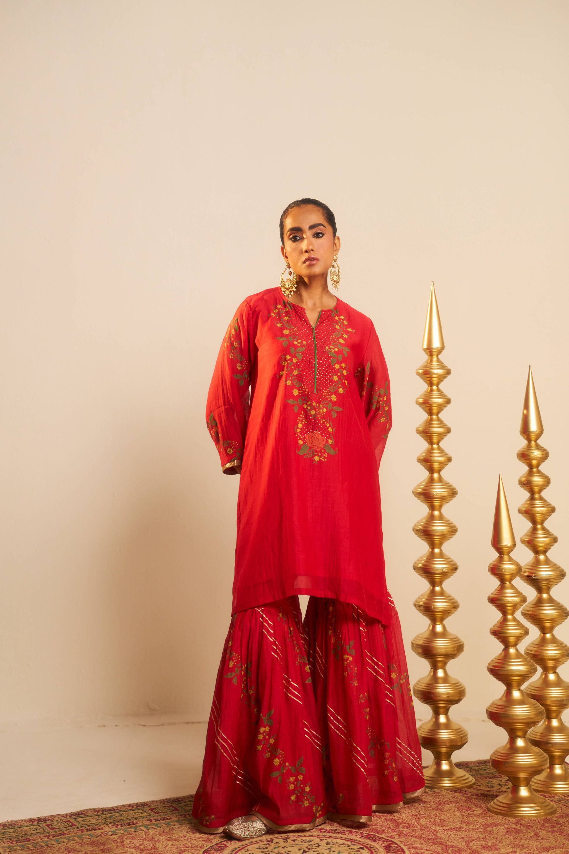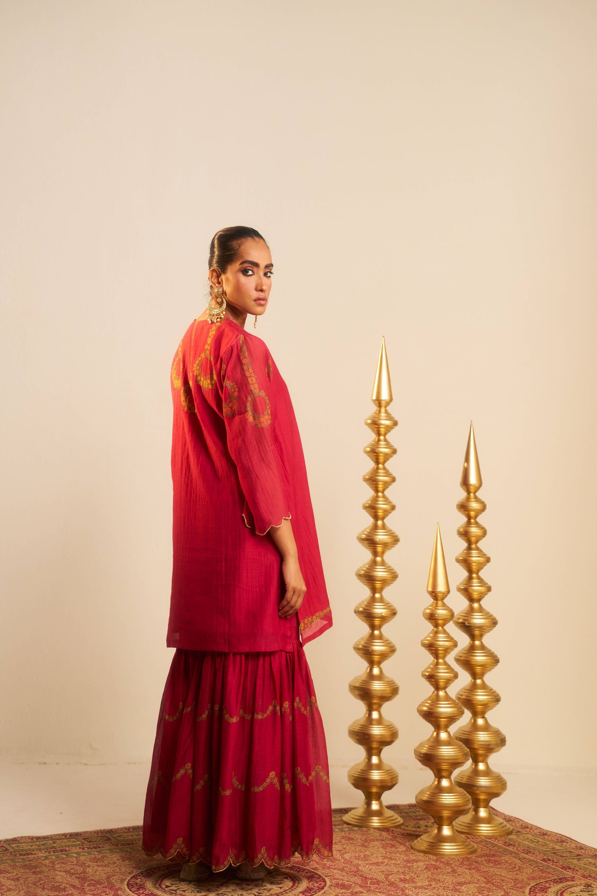 Siyaah red hand block printed dabka zardosi chanderi sharara set.