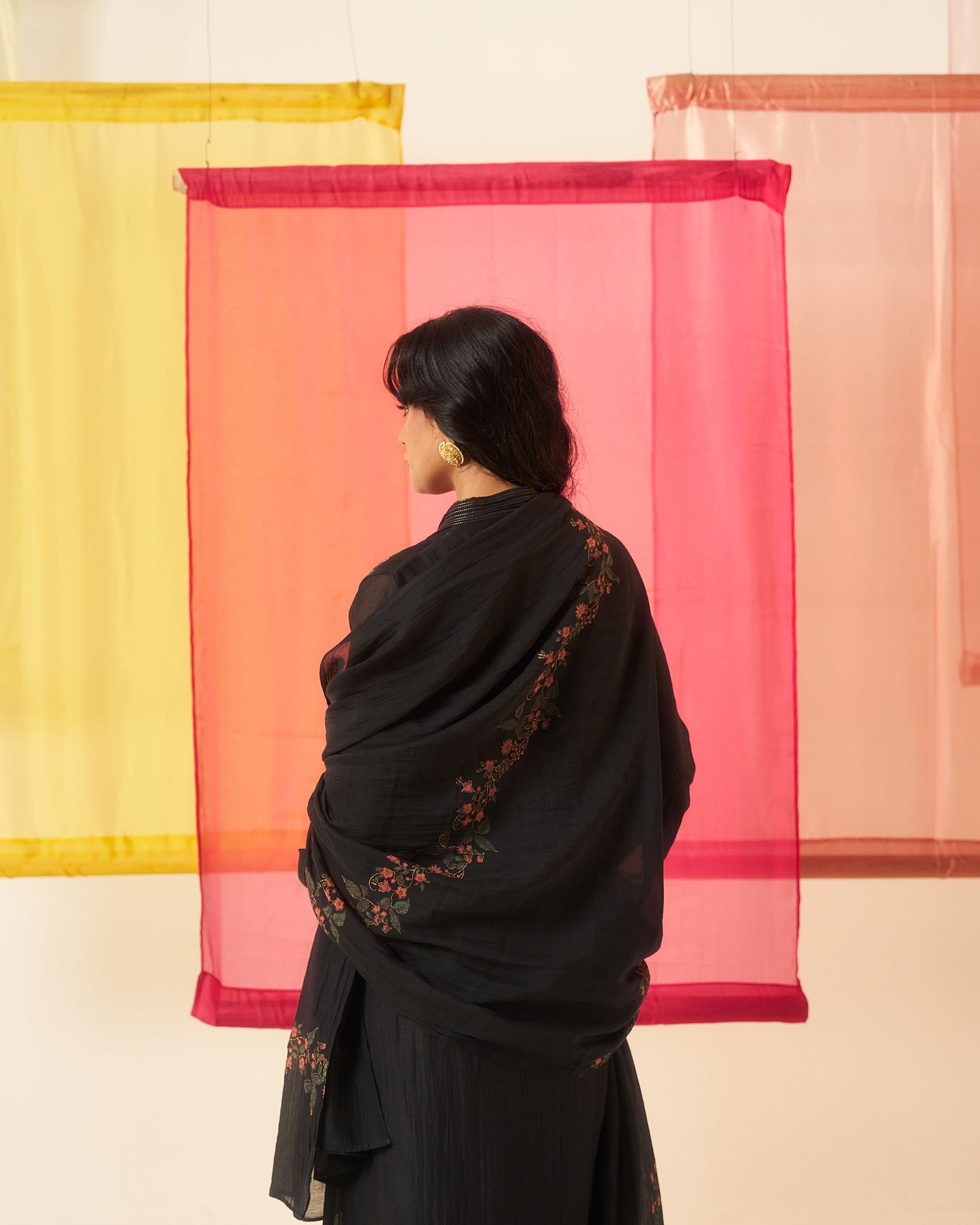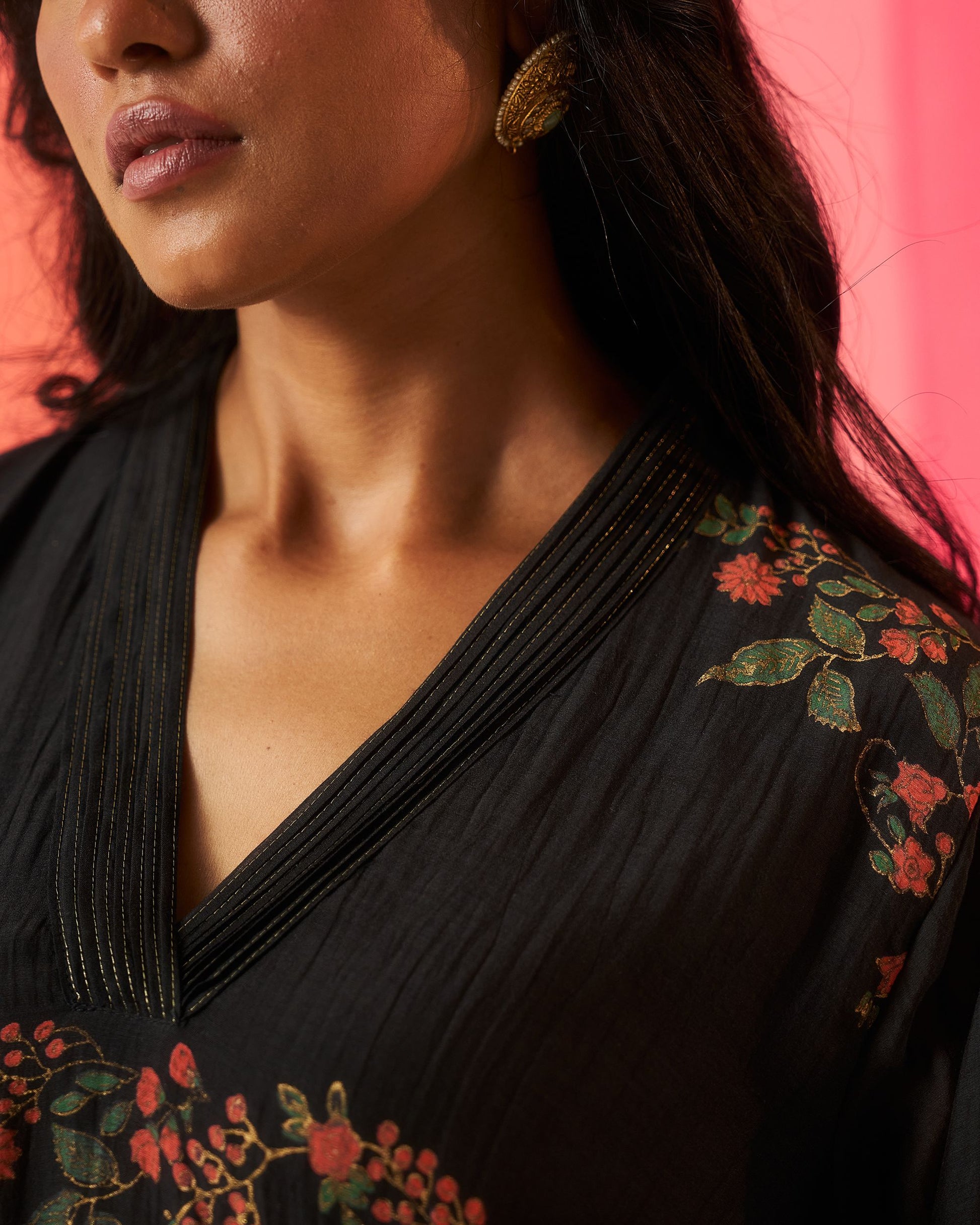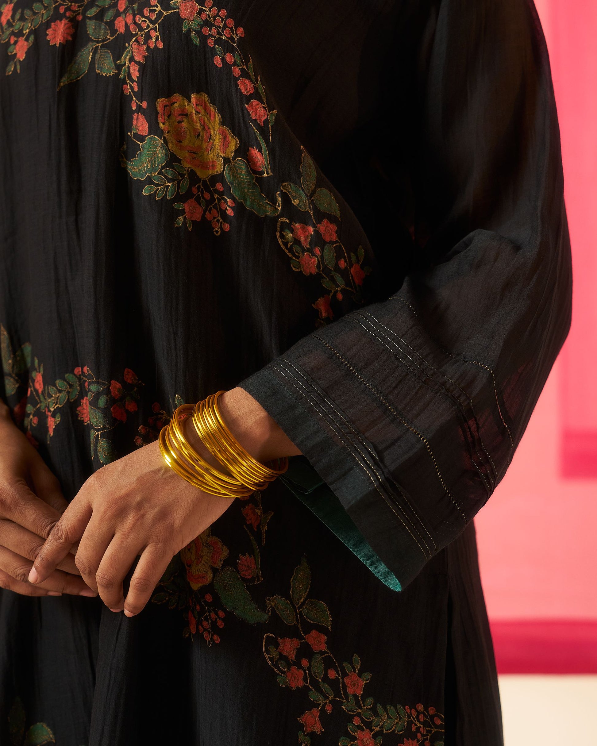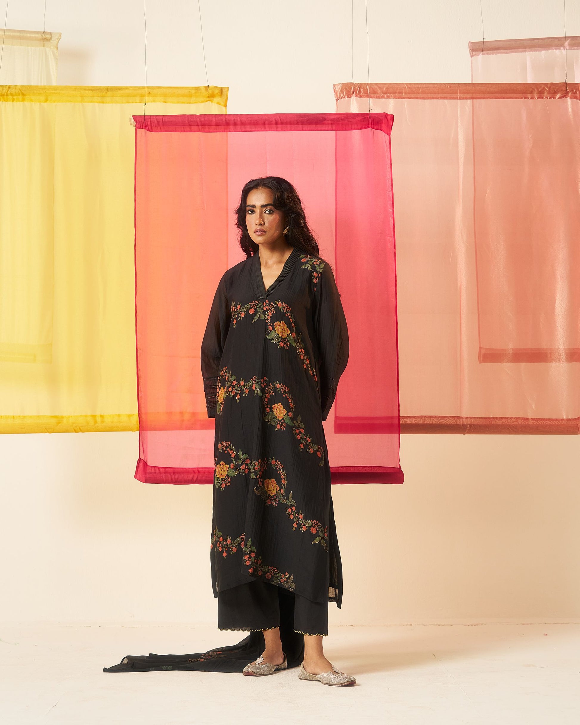 Siyah black hand block printed chanderi pintuck kurta set.