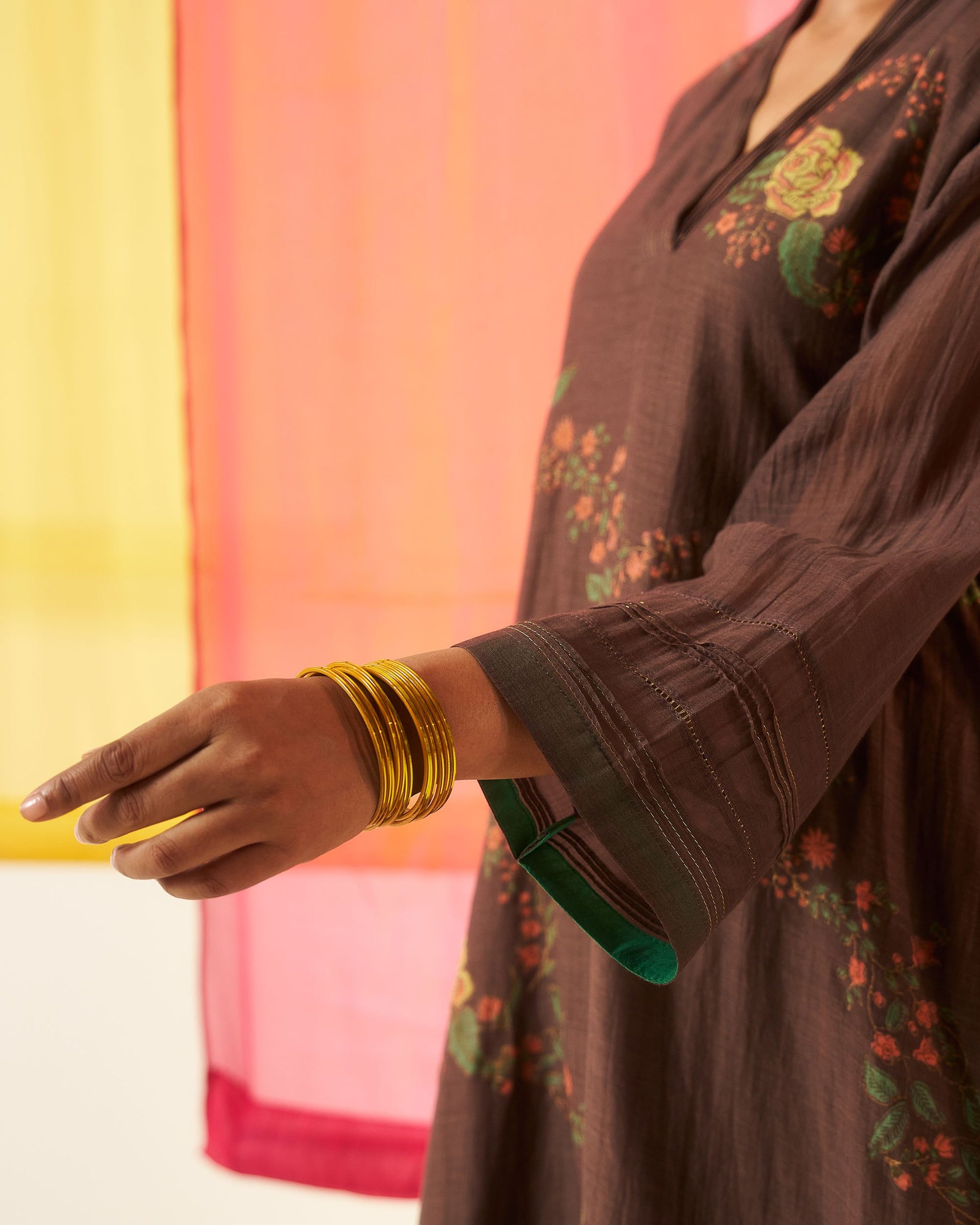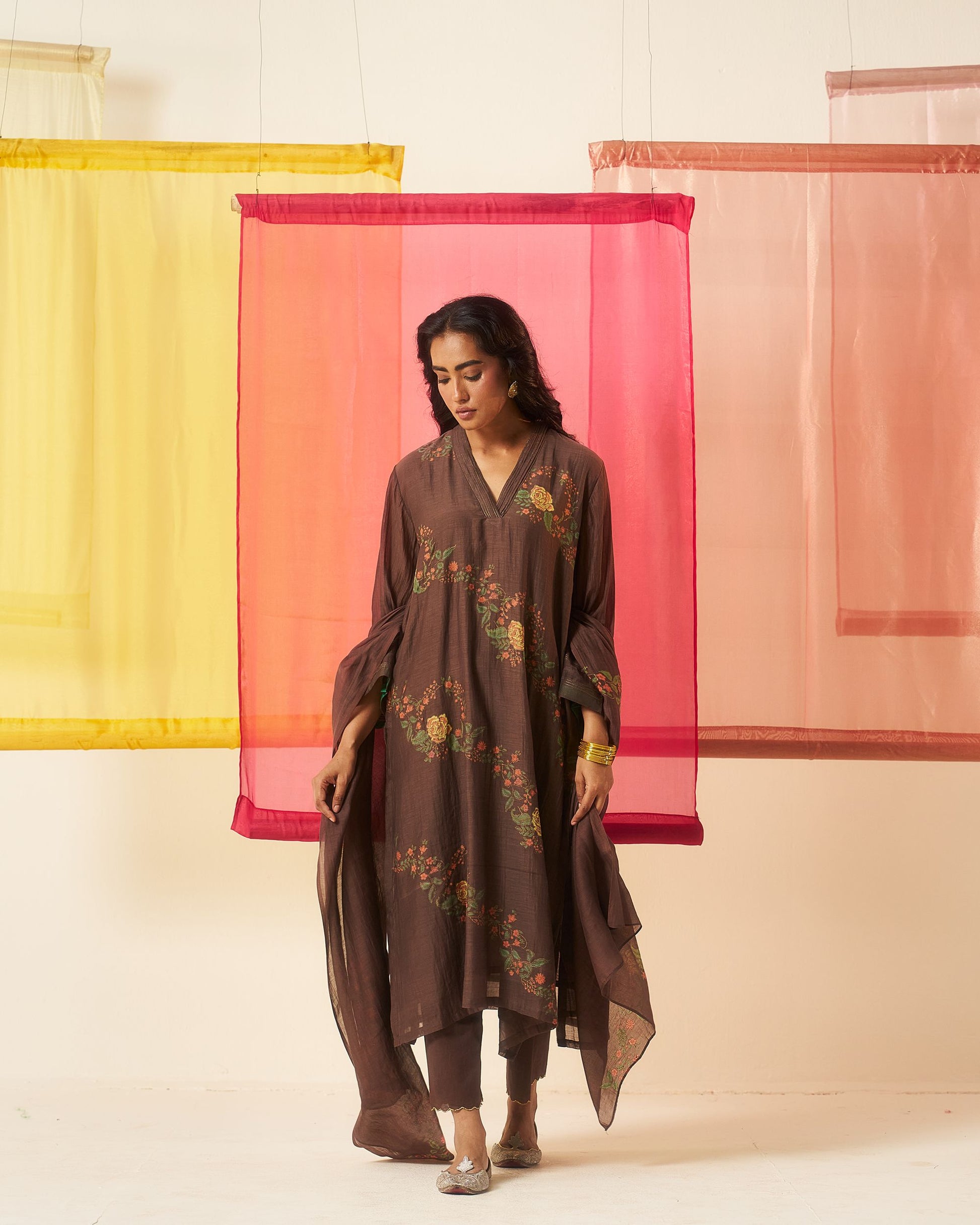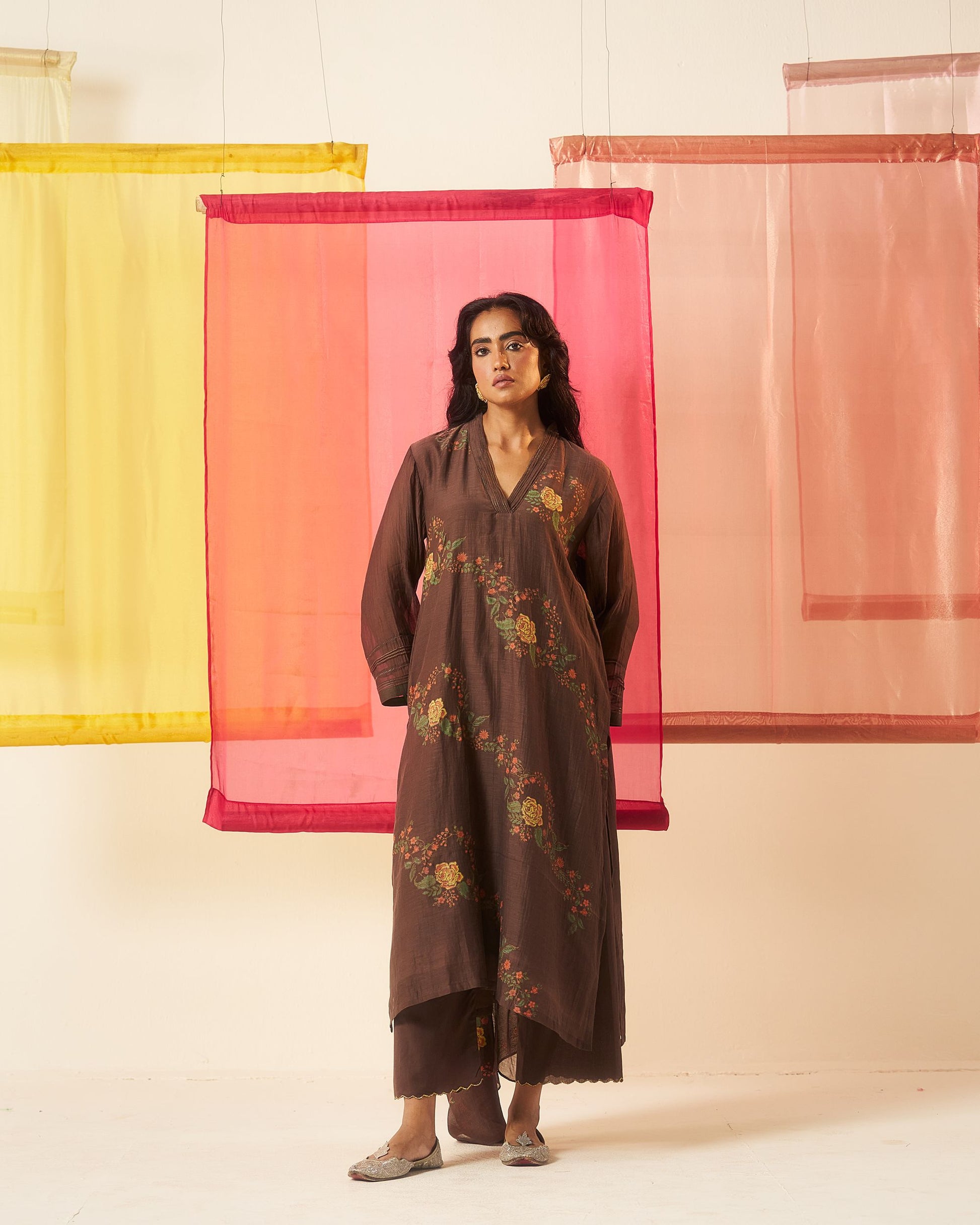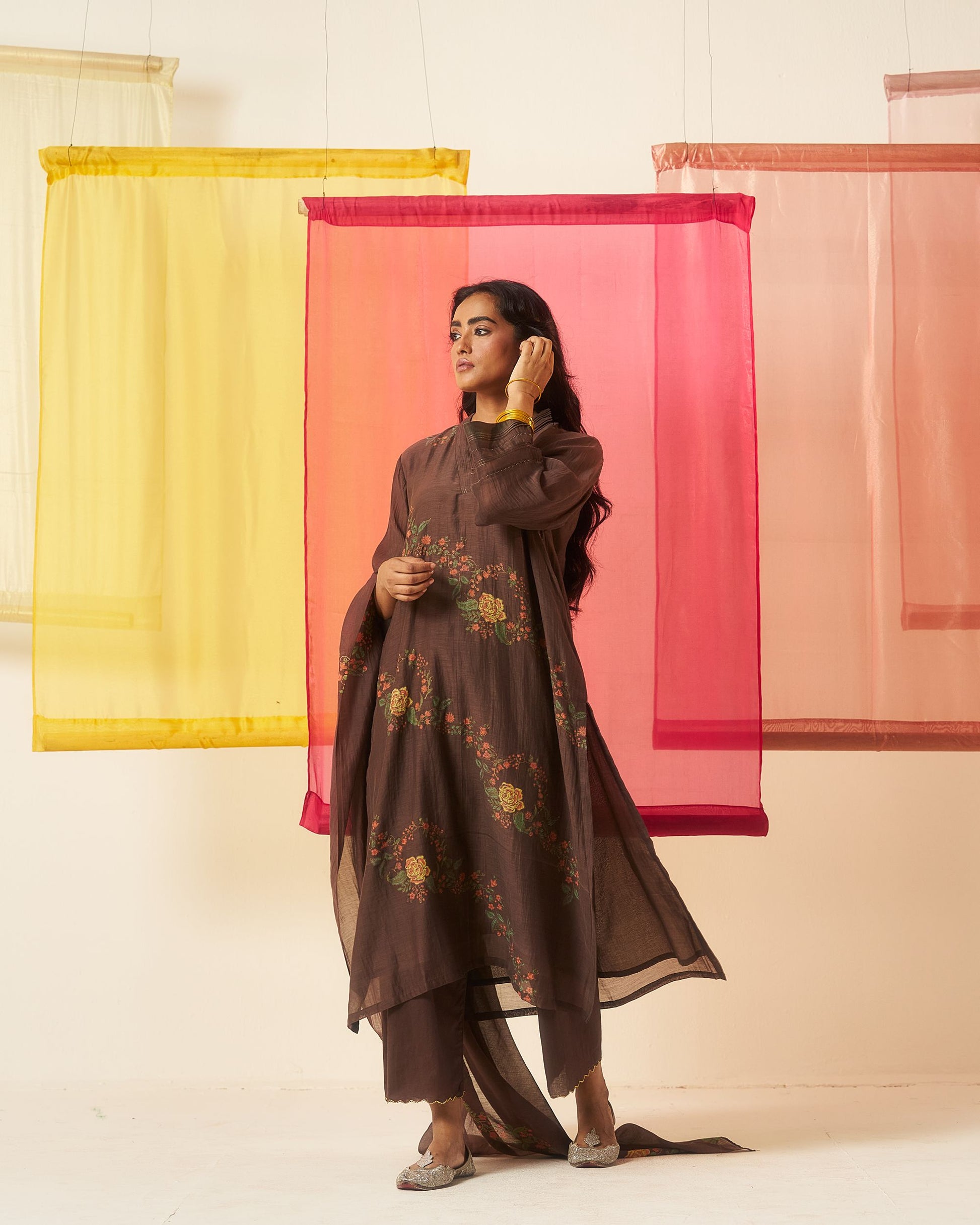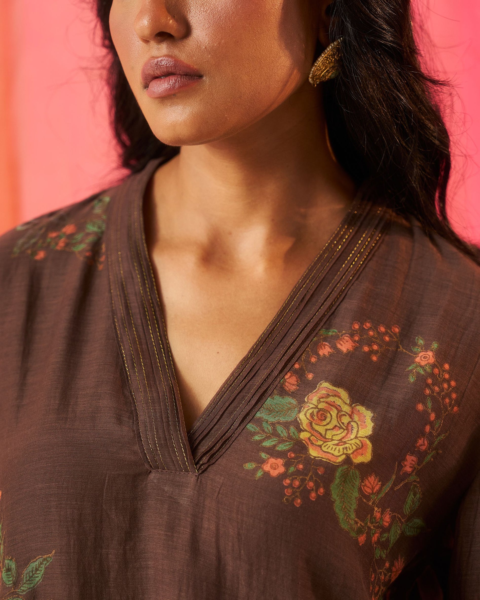 Siyah brown hand block printed chanderi pintuck kurta set.