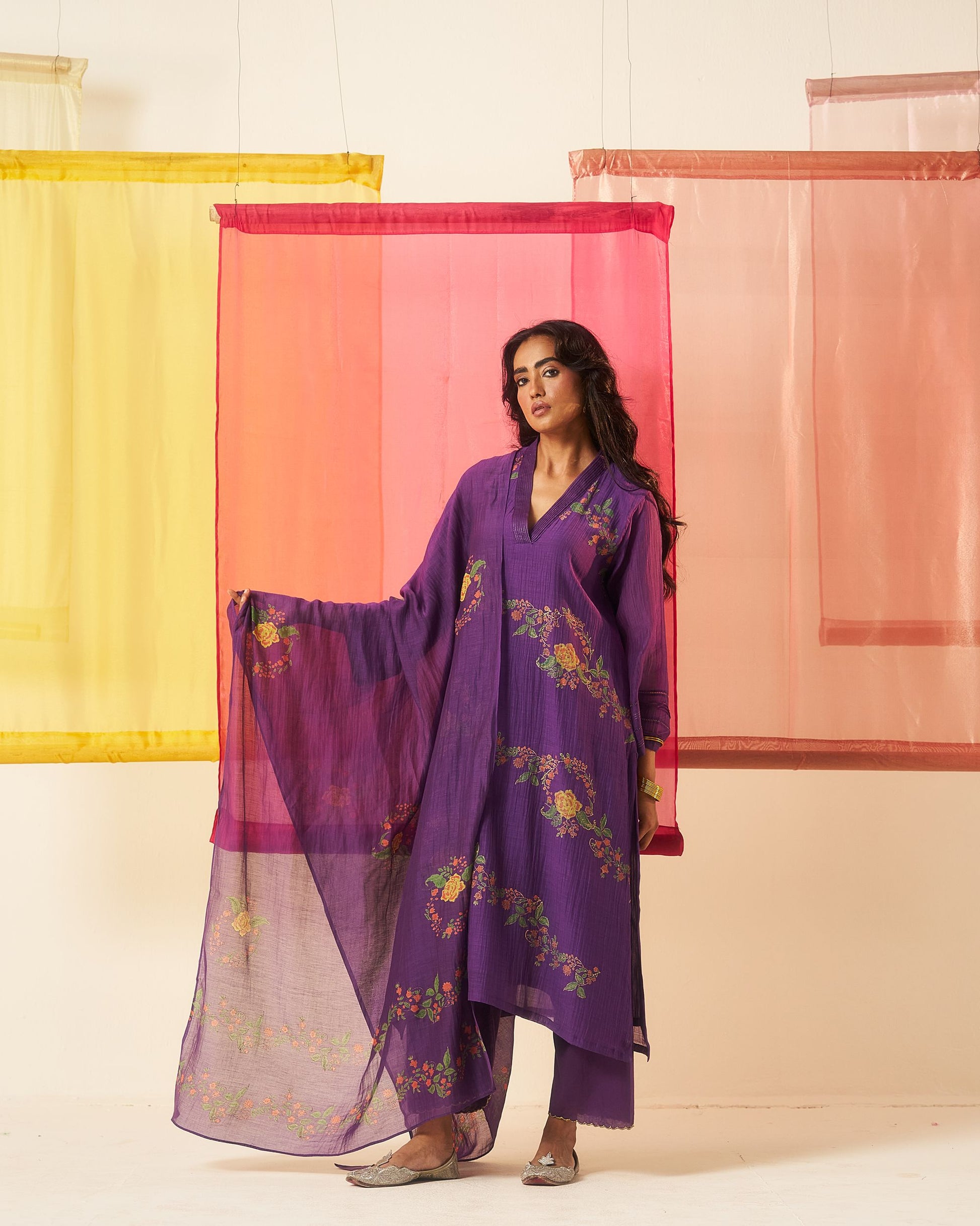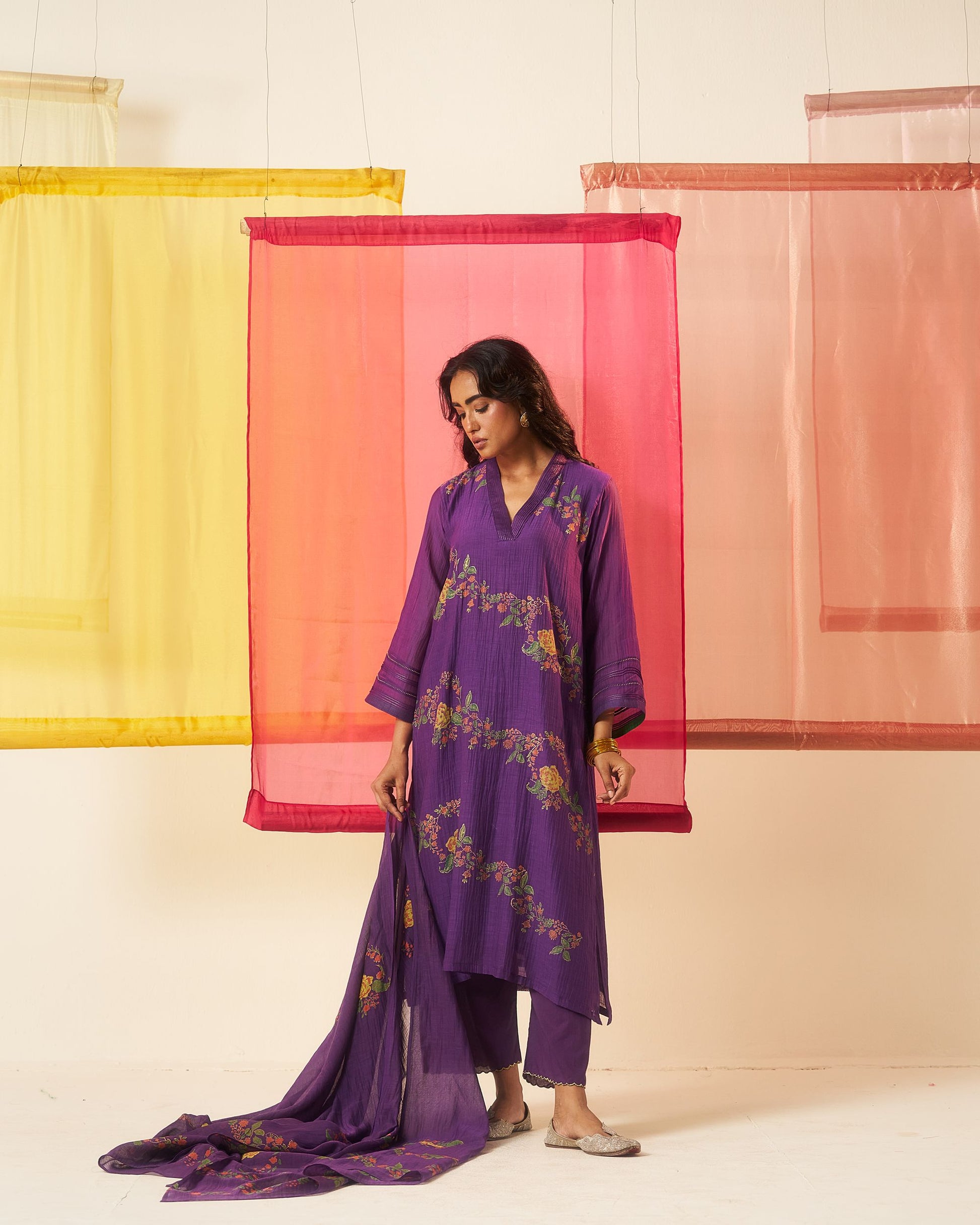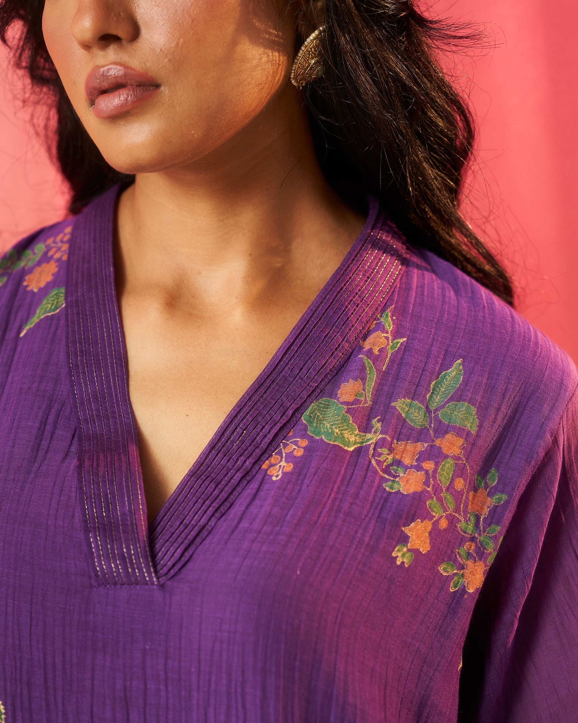 Siyah purple hand block printed chanderi pintuck kurta set.