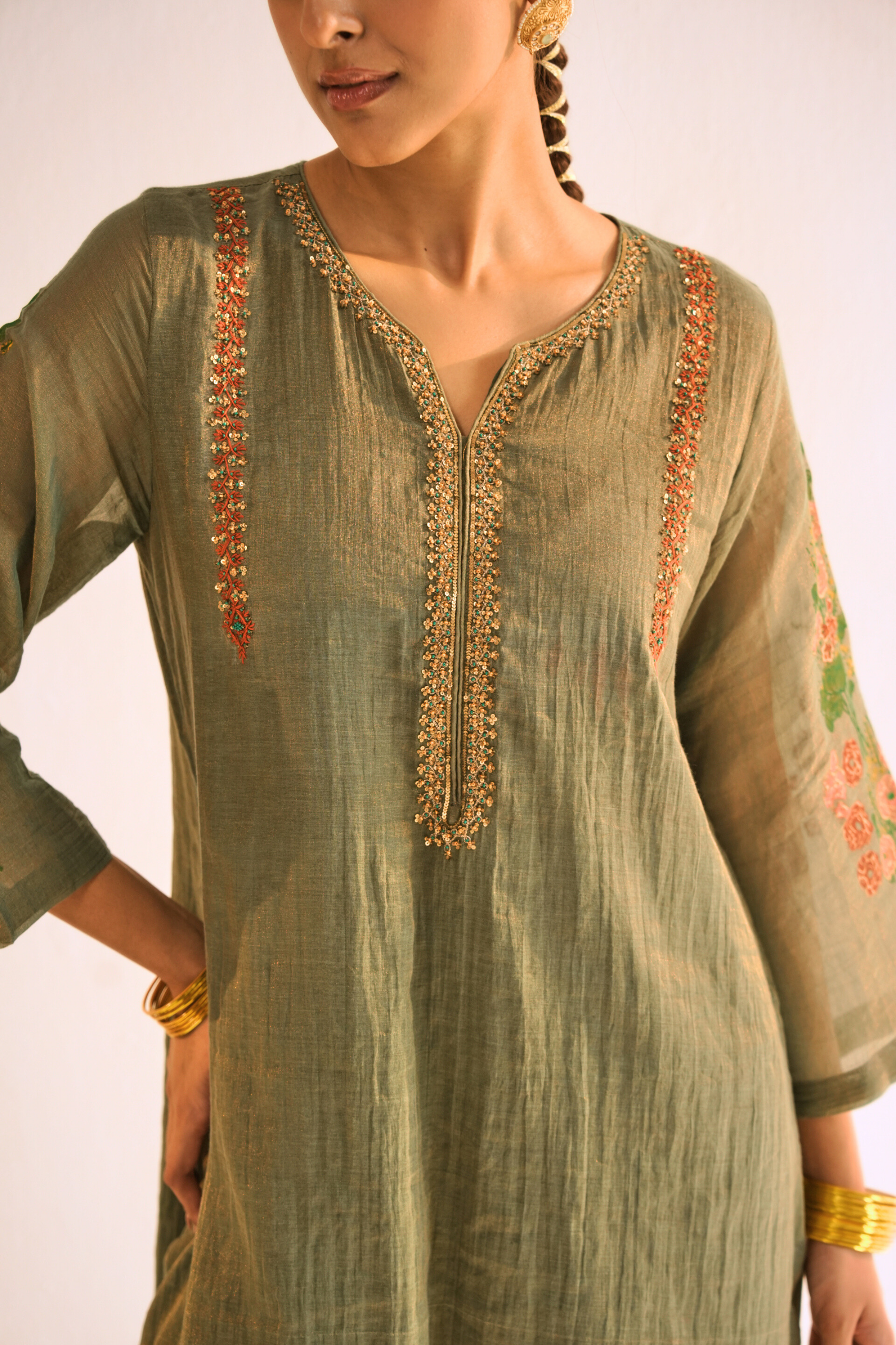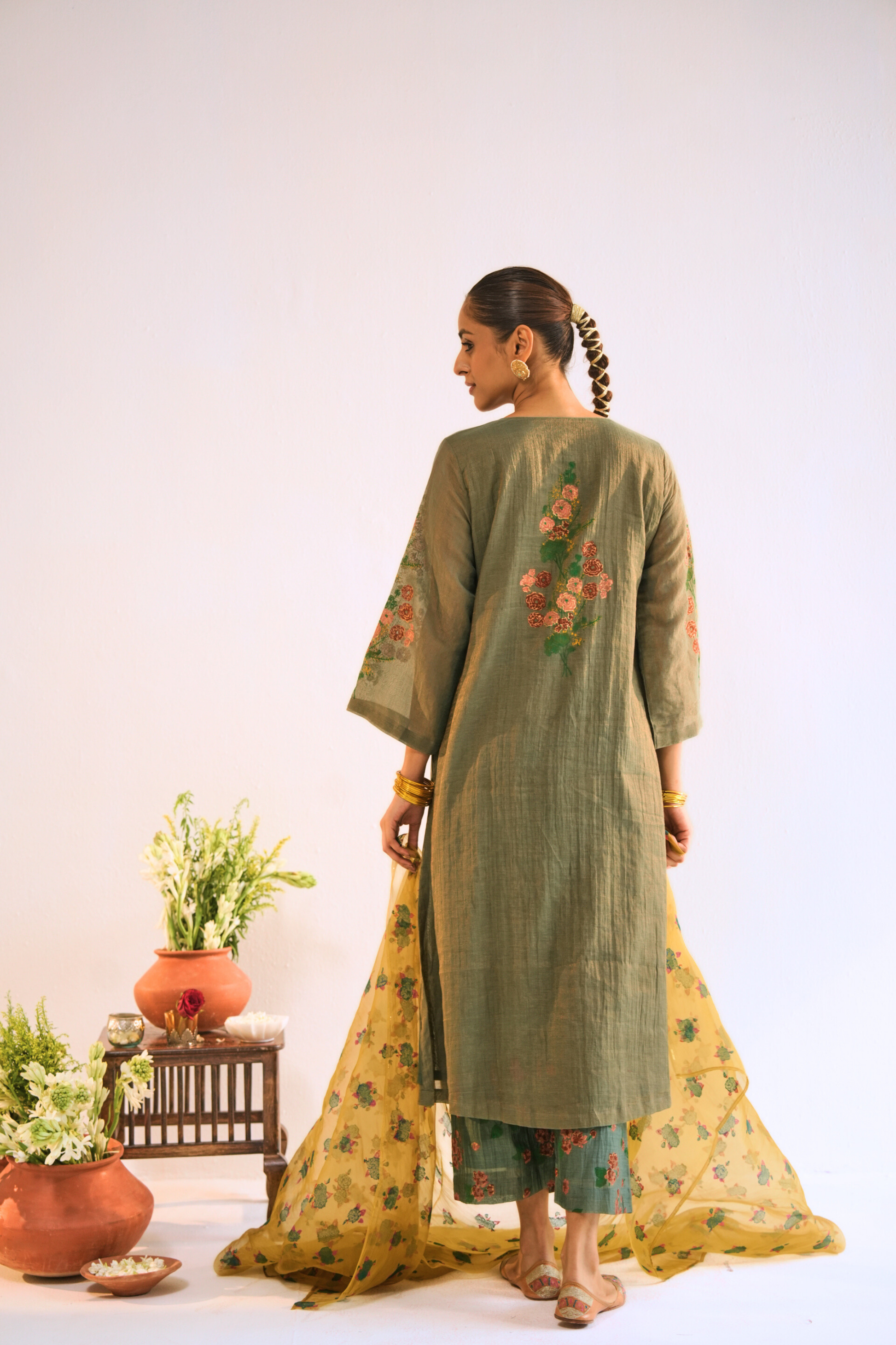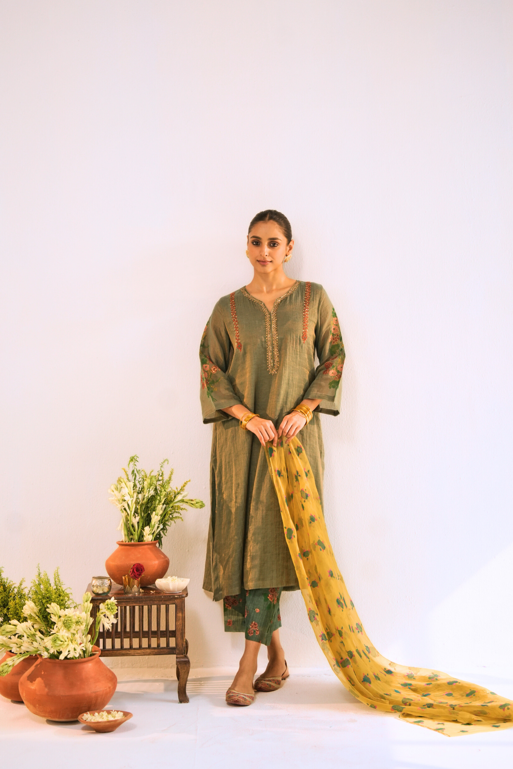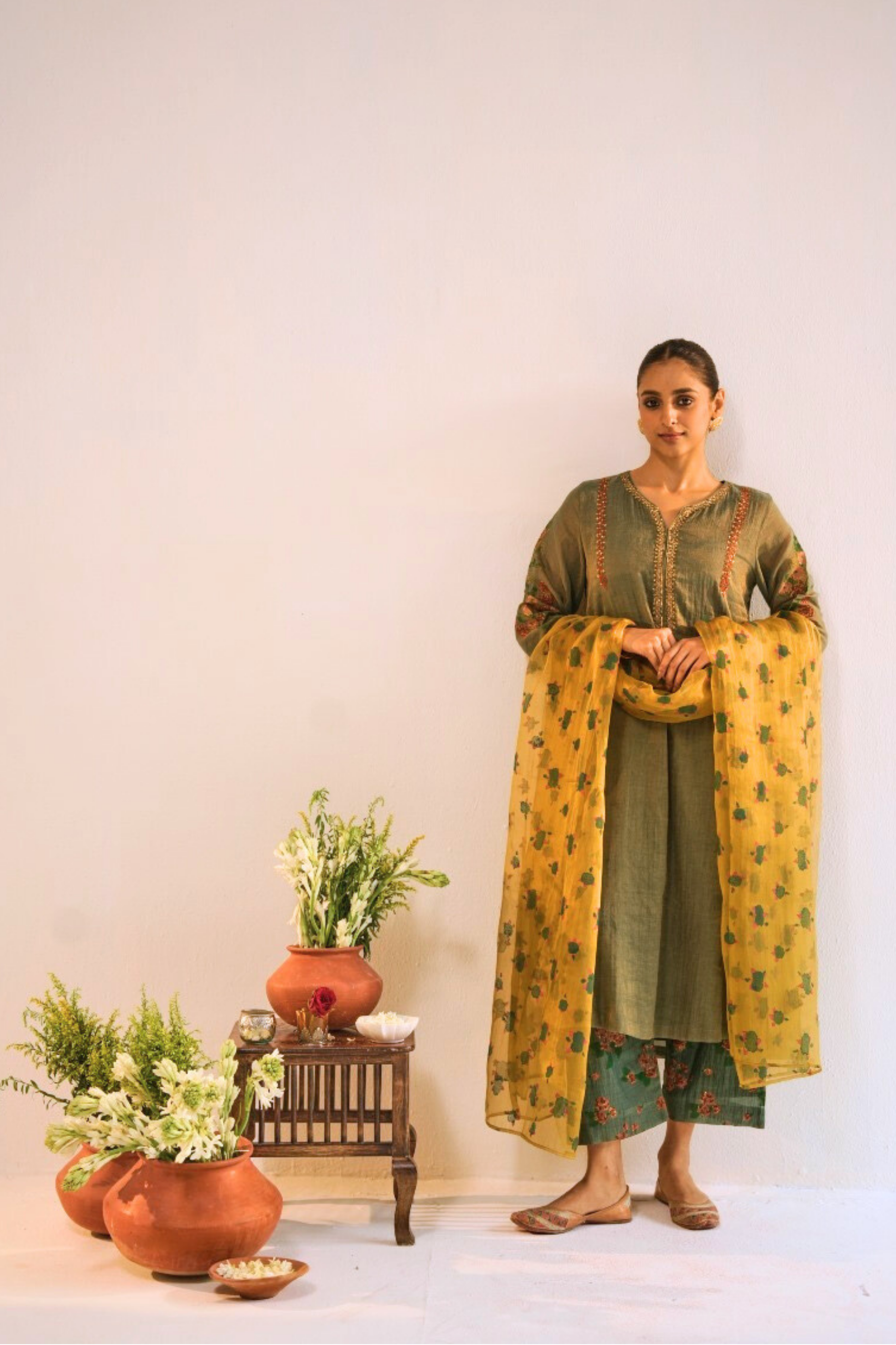 Ibaadat aqua grey hand block printed chanderi tissue kurta set (set of 3)