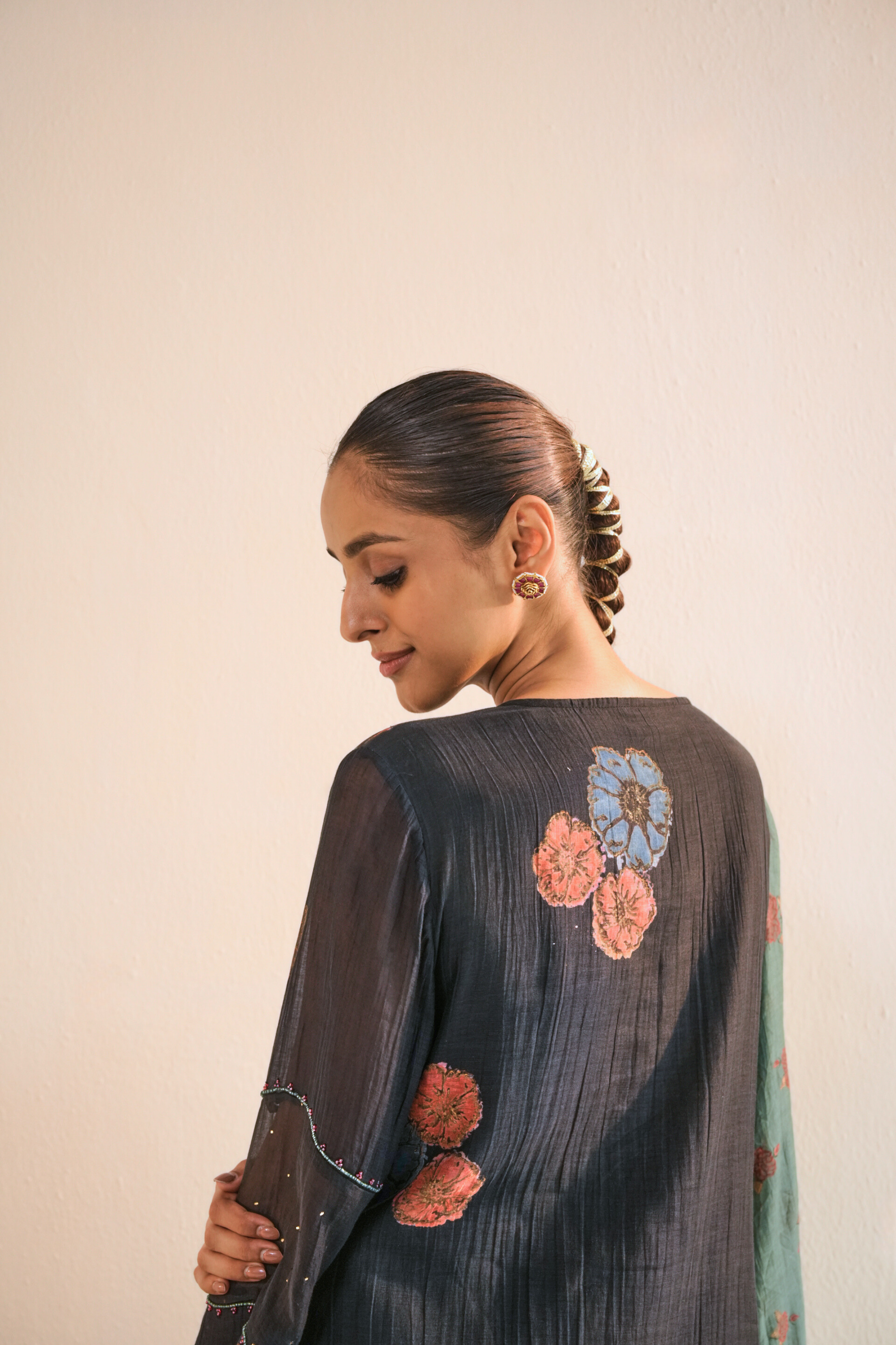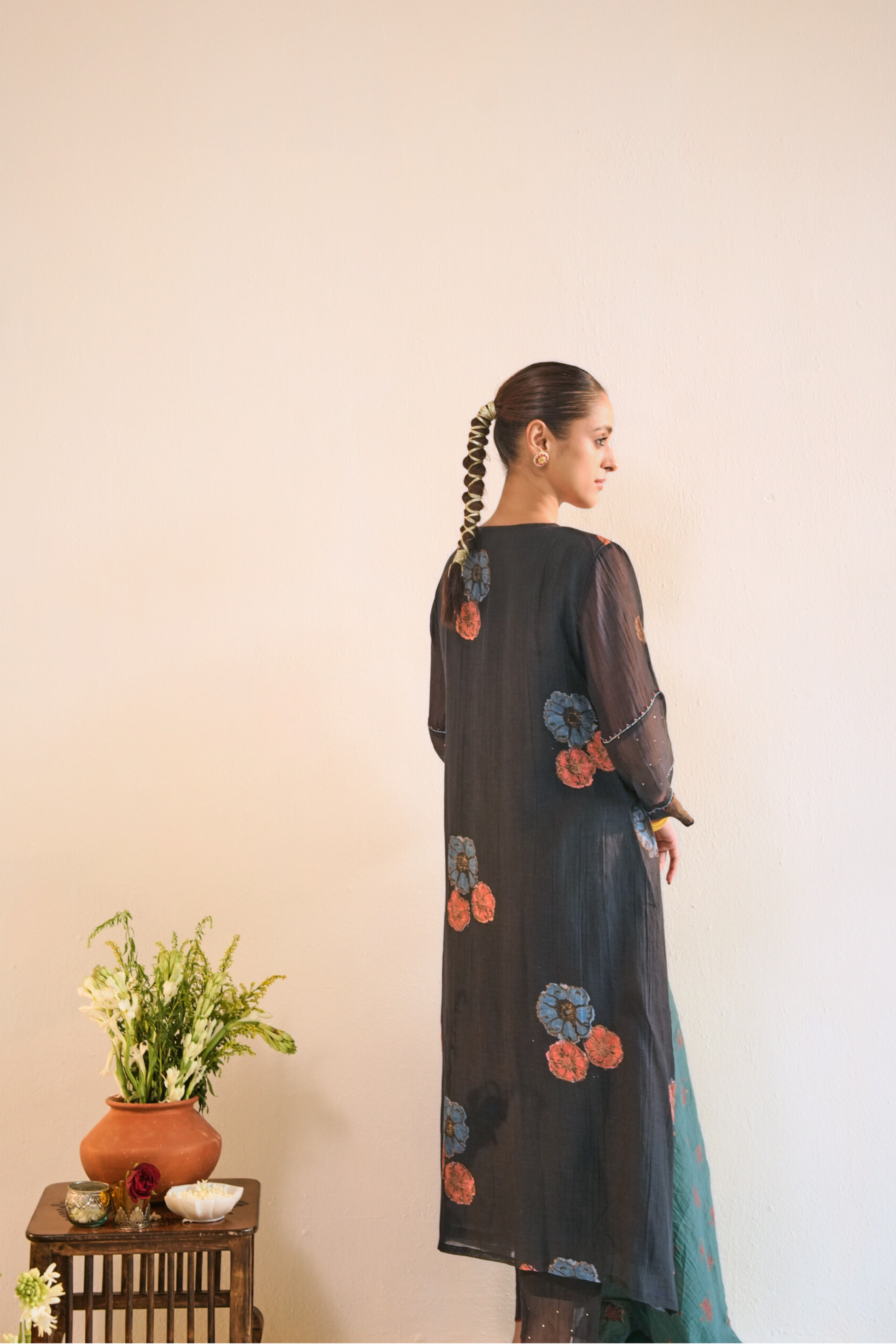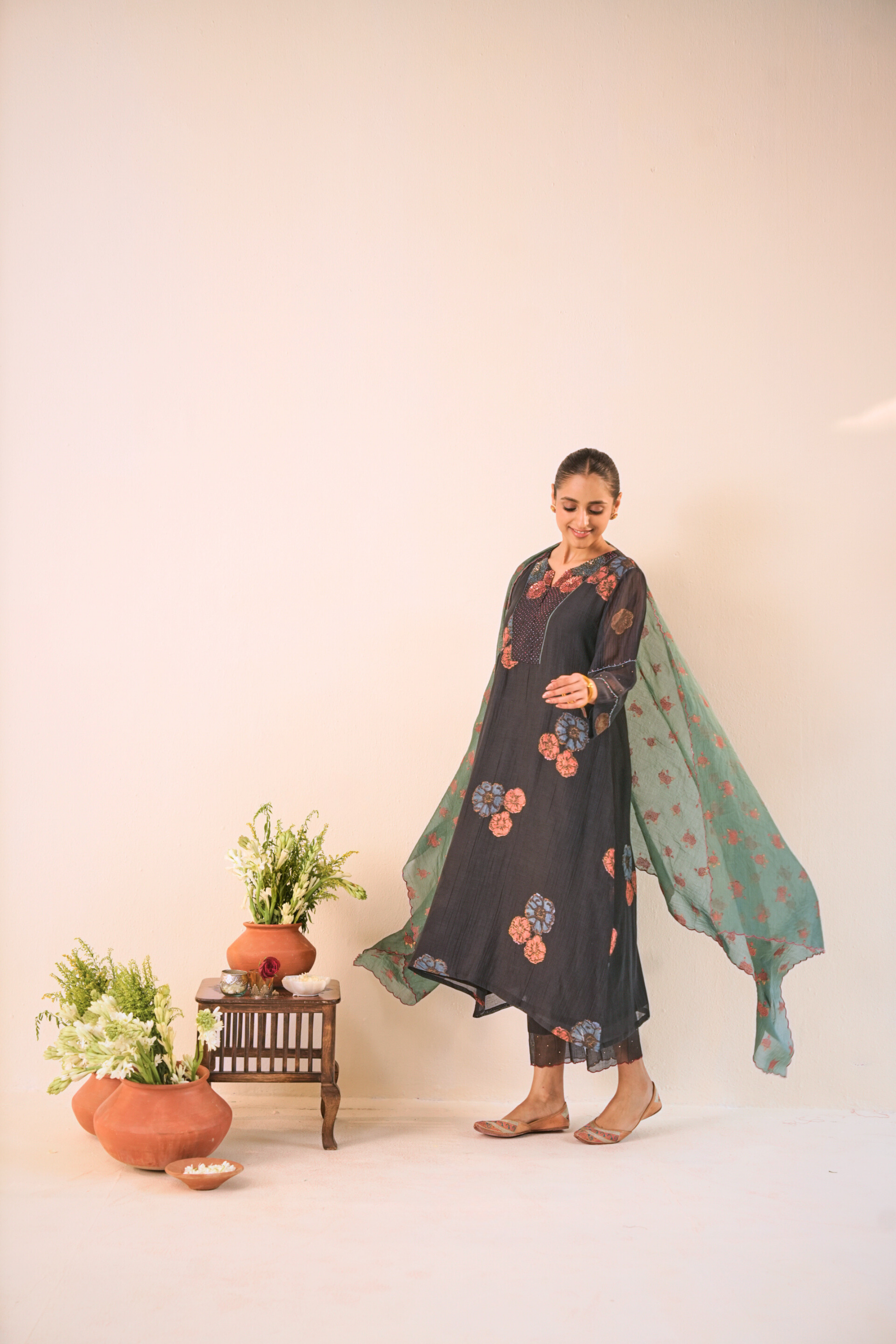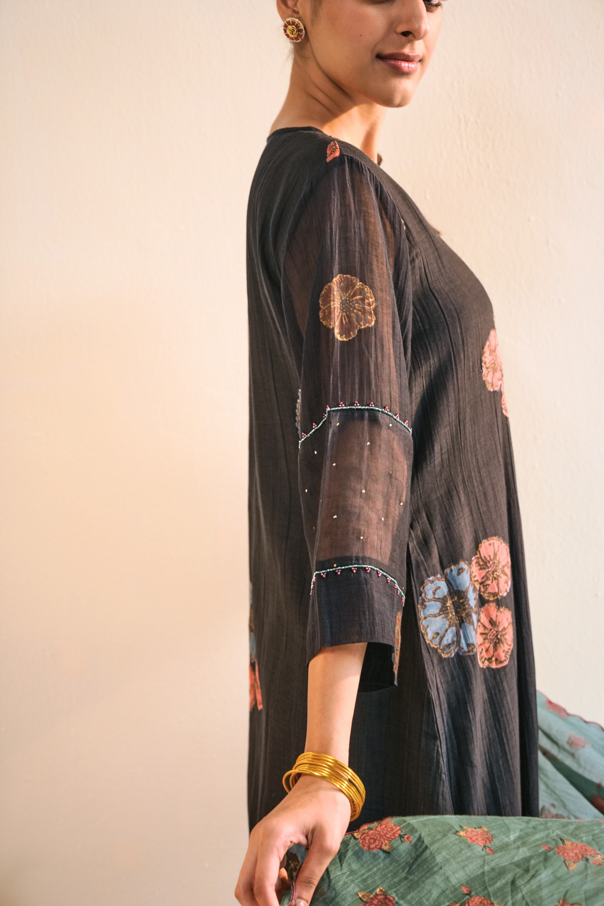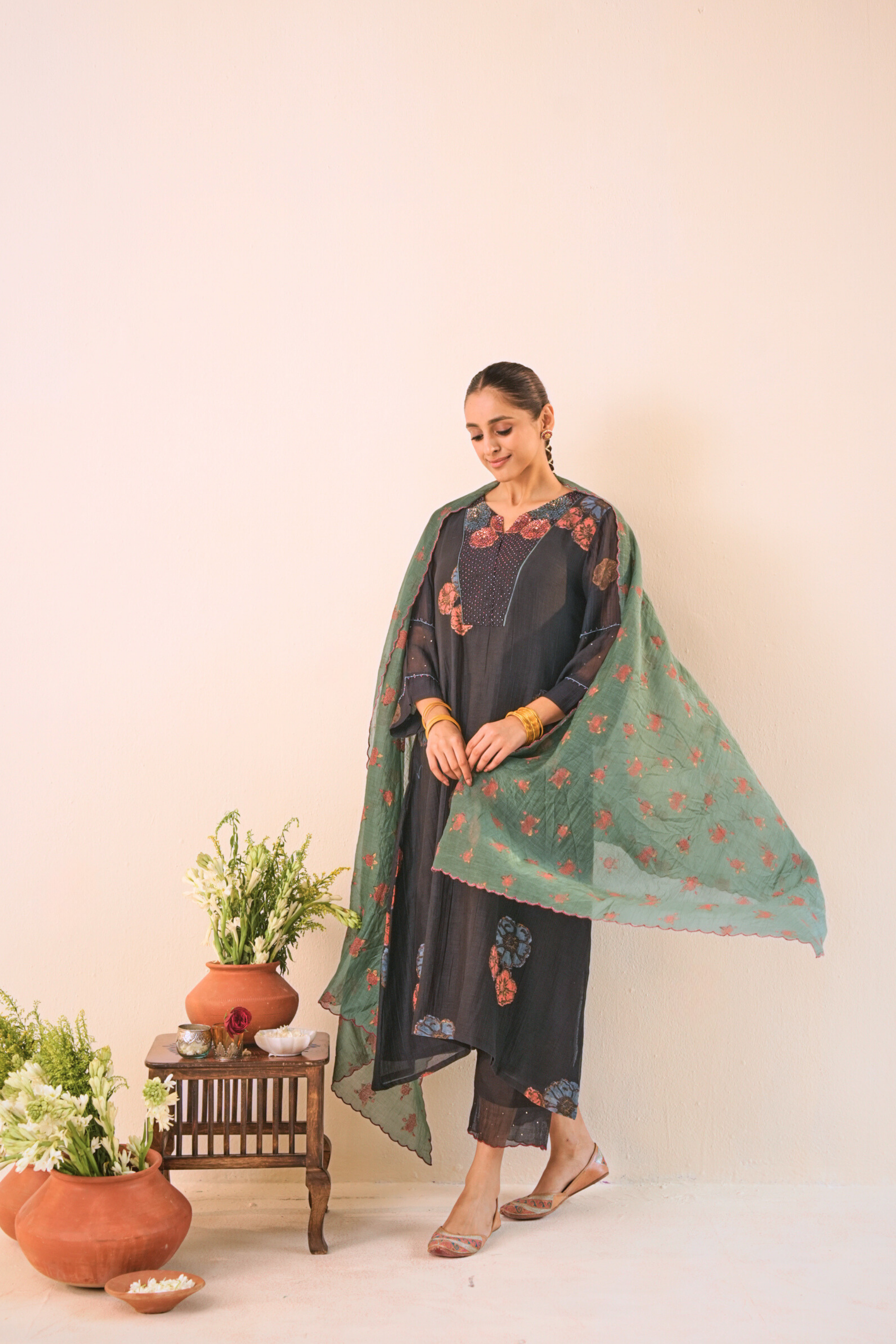 Surmayee black hand block printed chanderi kurta set (set of 3)