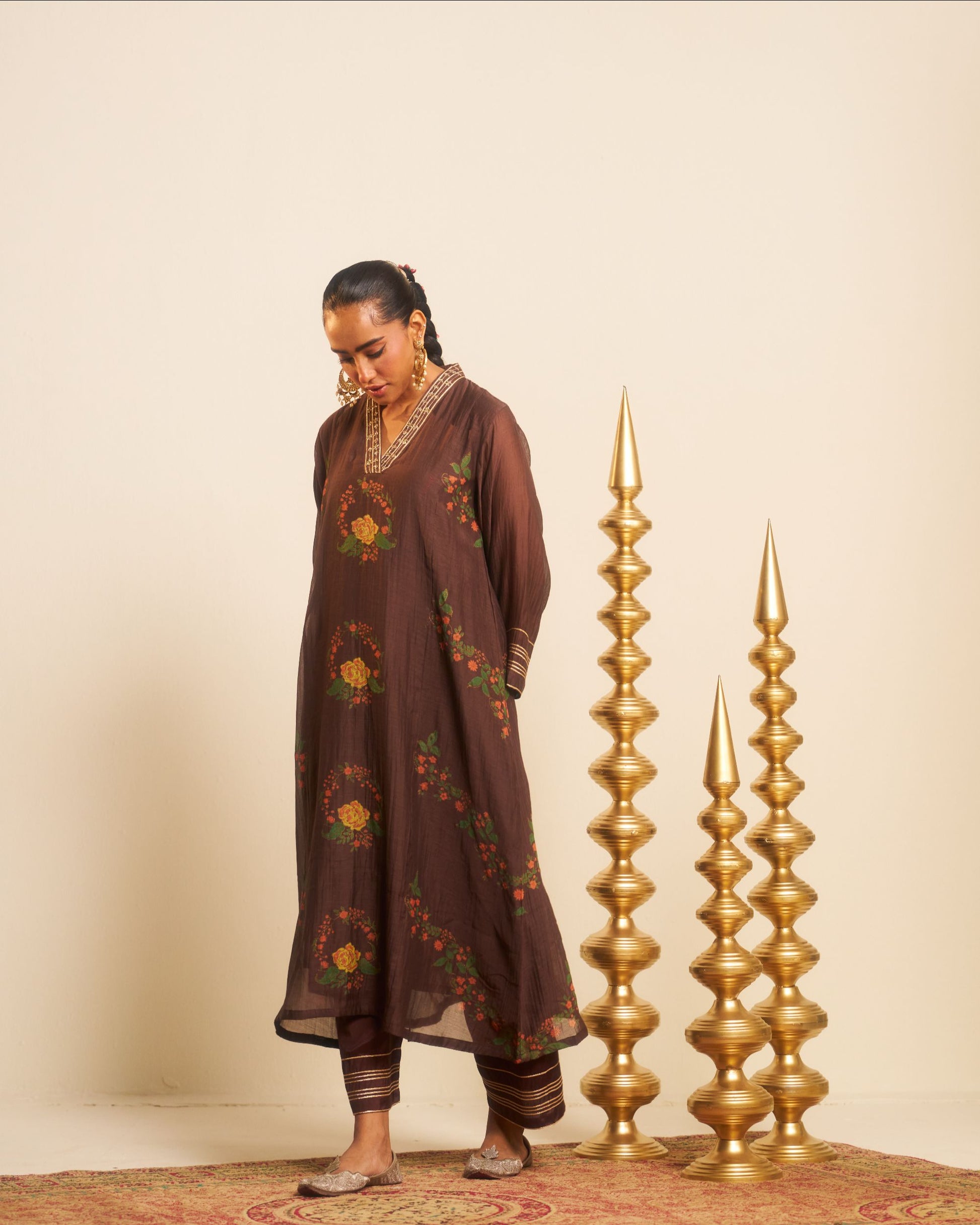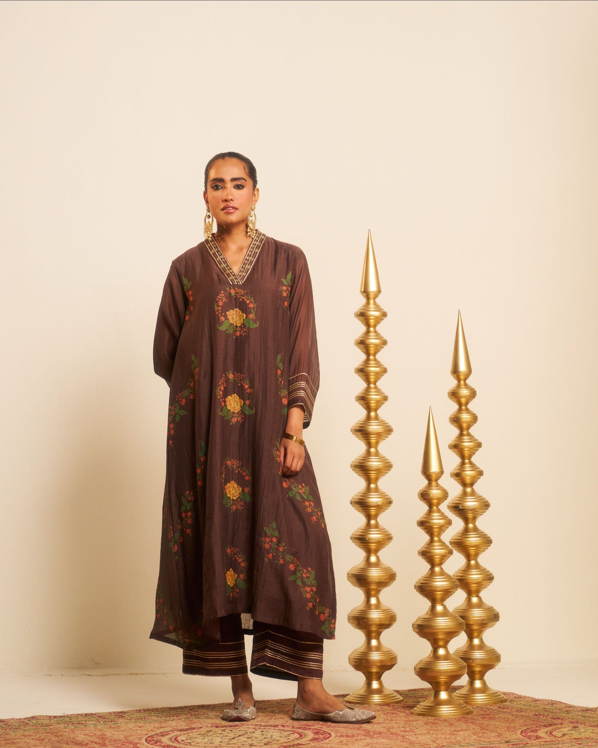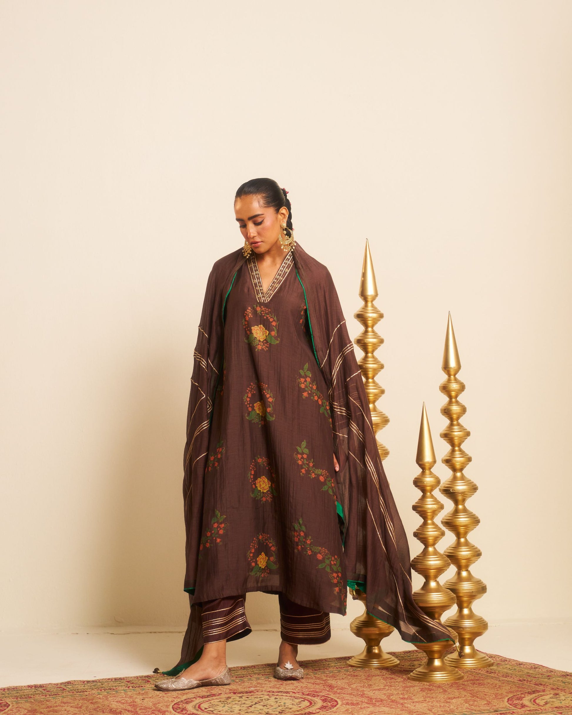 Tehran brown hand embroidered and block printed chanderi kalidar kurta set.