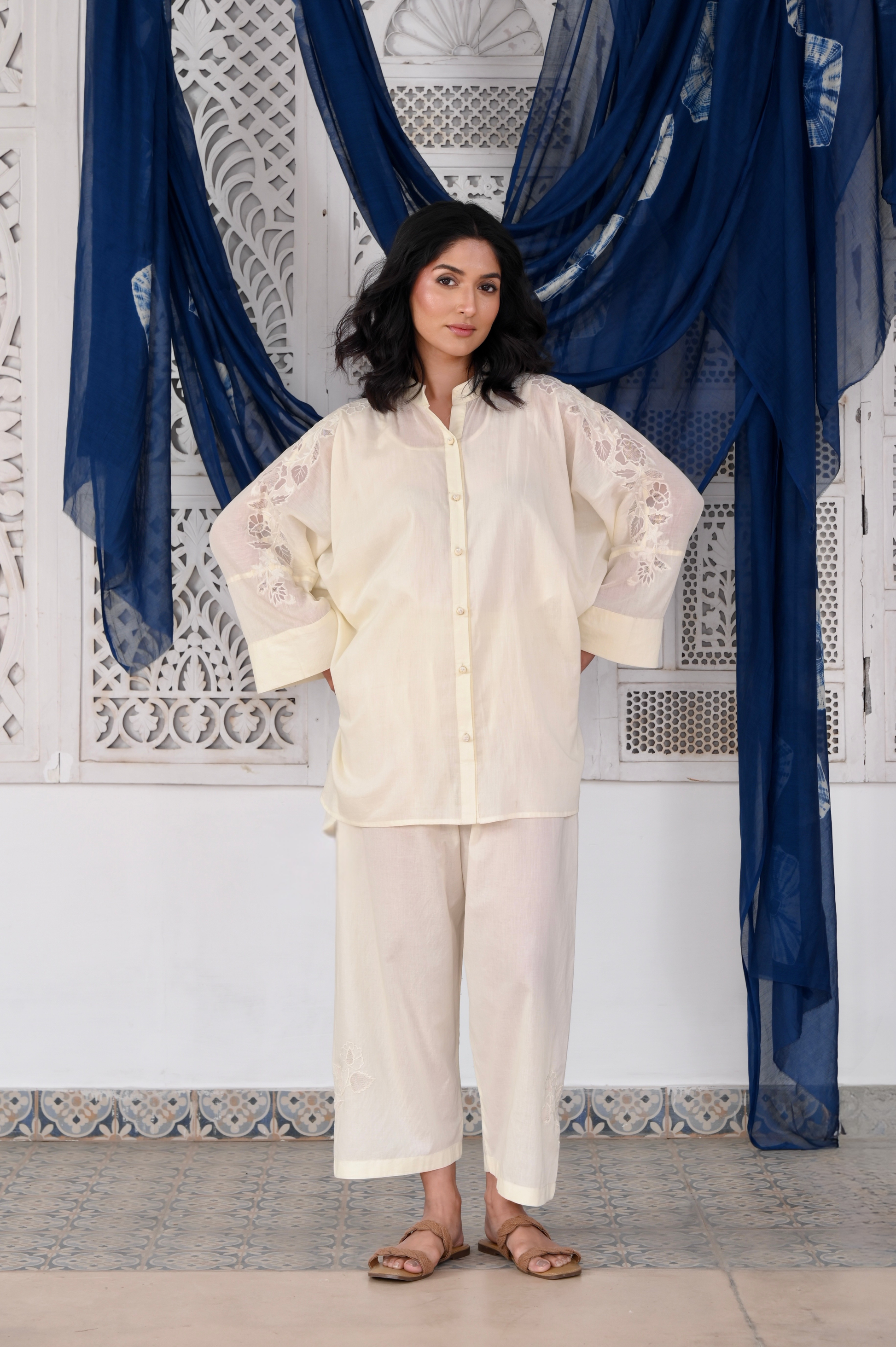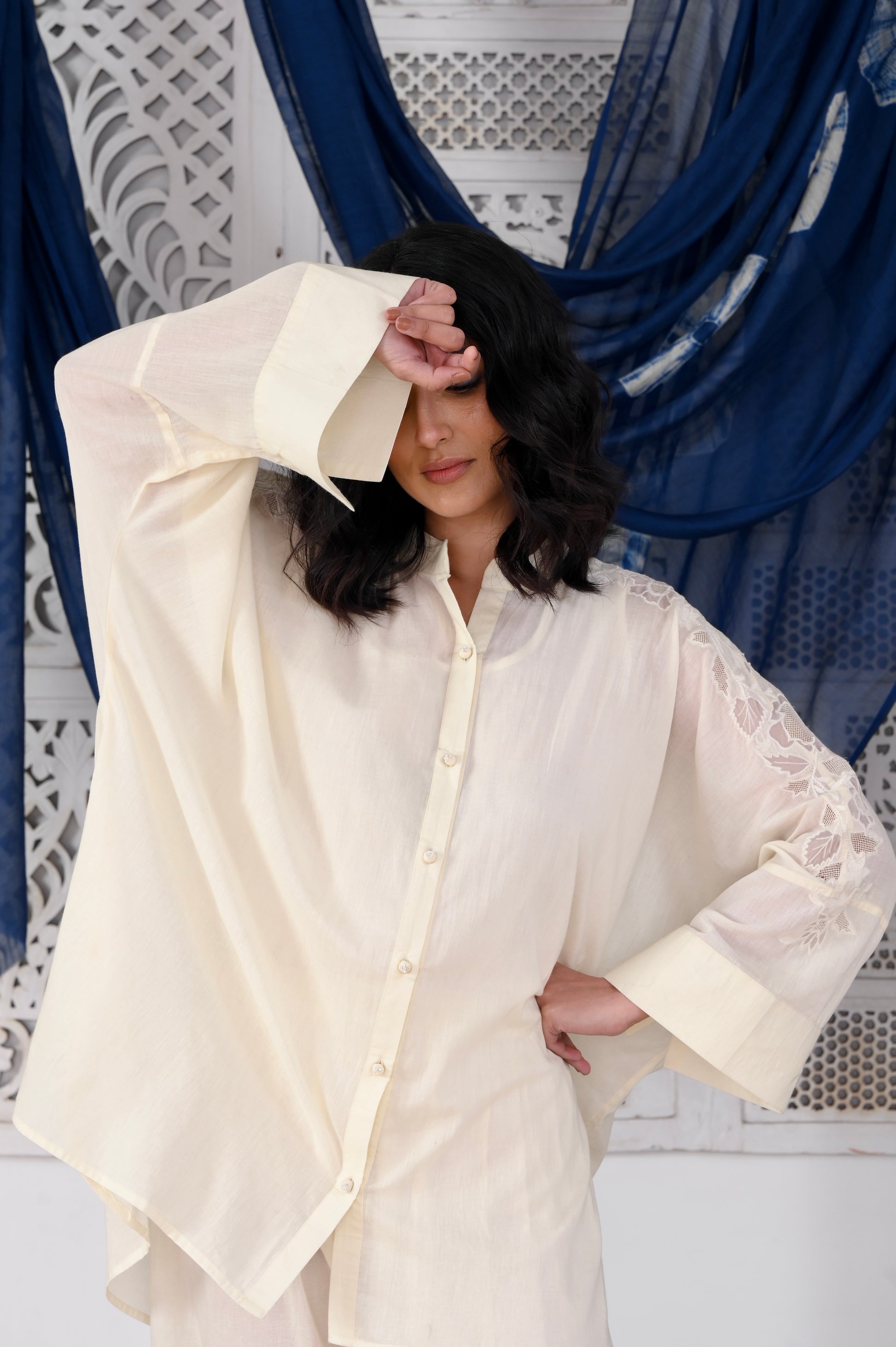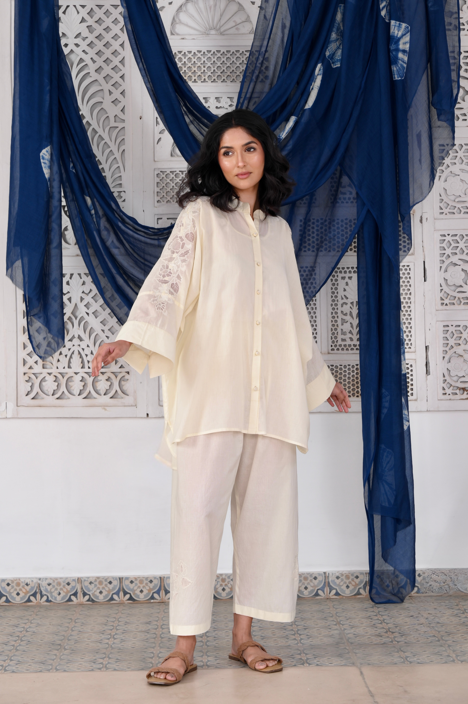 Zeenat ivory organza patchwork and shoulder thread embroidered mulmul kaftan (Pant separate)