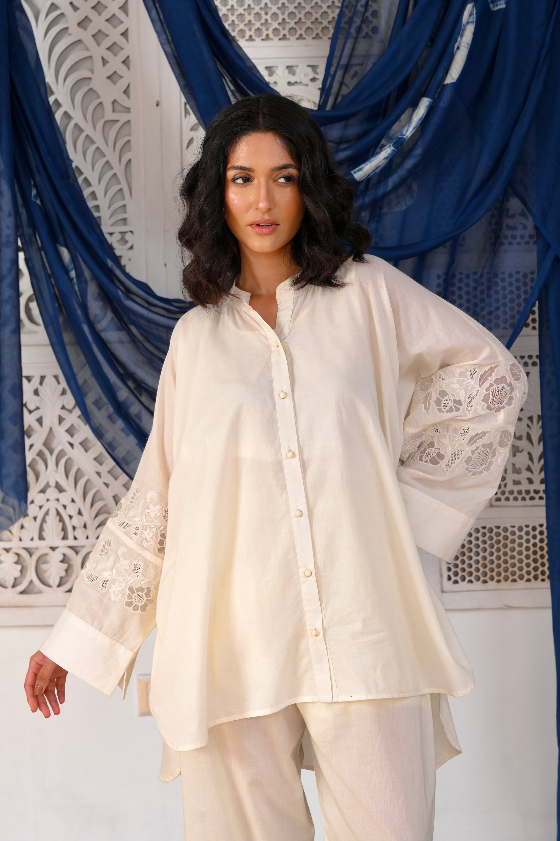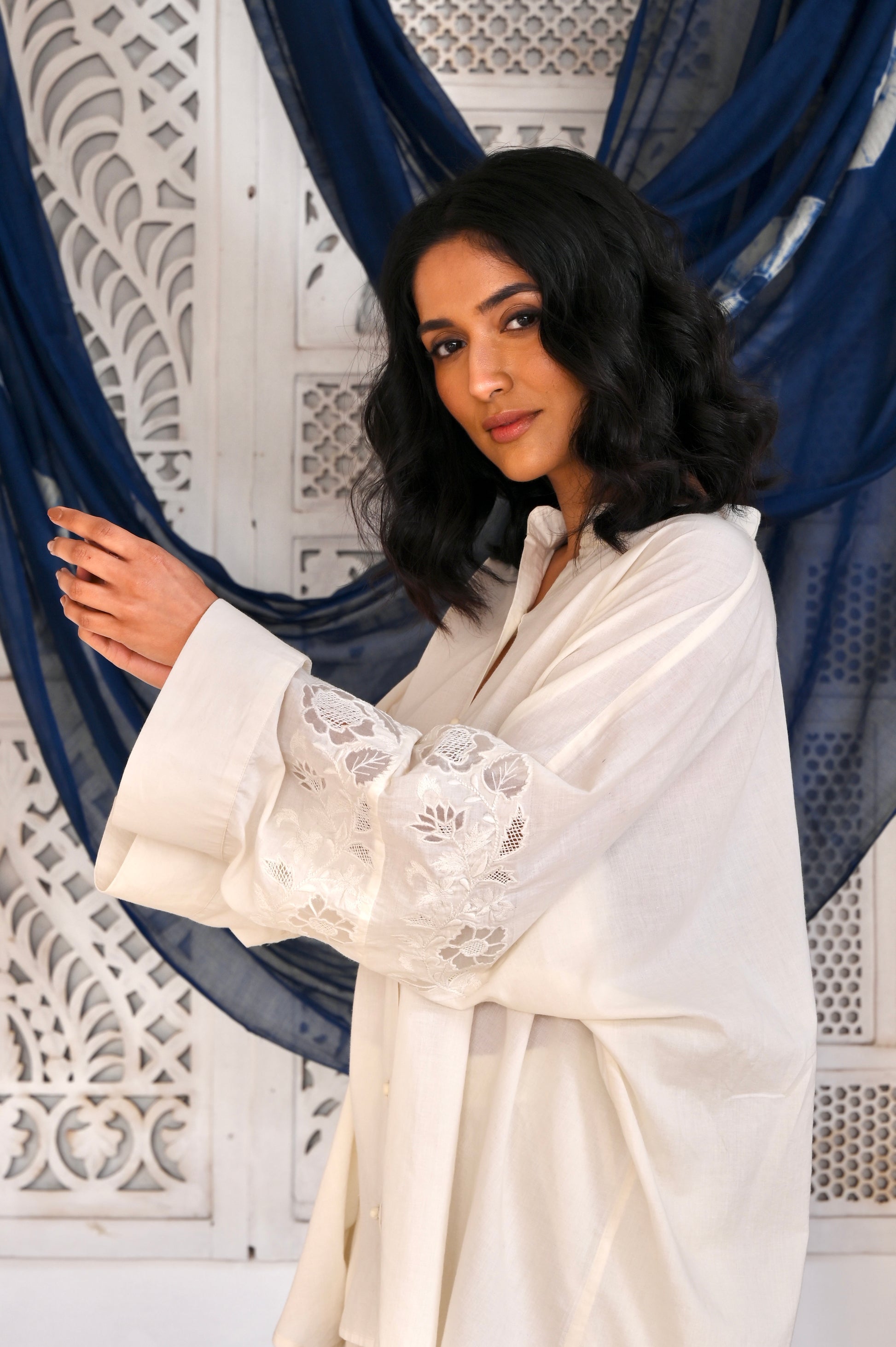 Zeenat ivory organza patchwork and thread embroidered mulmul kaftan (Pant separate)